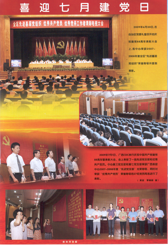 2009年6月30日,在自治区召开的庆祝建党88周年表彰大会上,广西疾控中心荣获2007-2008年度全区“先进基层党组织”荣誉称号并受到表彰。