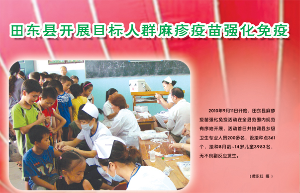 2010年9月11日开始,田东县麻疹强化免疫活动在全县范围内规范有序地开展,活动首日共抽调县乡级卫生专业人员200多名,设接种点361个,接种8月龄-14岁儿童3983名,无不良副反应发生。
