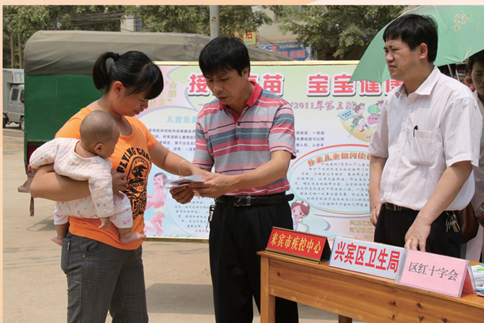 2011年4月26日,来宾市卫生局、市疾病预防控制中心、兴宾区卫生局和城南社区卫生 服务中心在兴宾区政府宣传长廊前开展了以“接种疫苗 宝宝健康”为主题的宣传活动,医务人员通过悬挂横幅、发放宣传资料、展出板报、张贴宣传画、现场义诊和接受咨询等多样形式,科学通俗地向市民传播了预防接种知识。