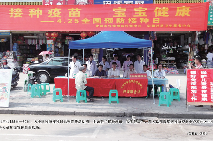 宝宝健康”,图为钦州市疾控中心和社区卫生服务中心医务人员参加宣传咨询活动。