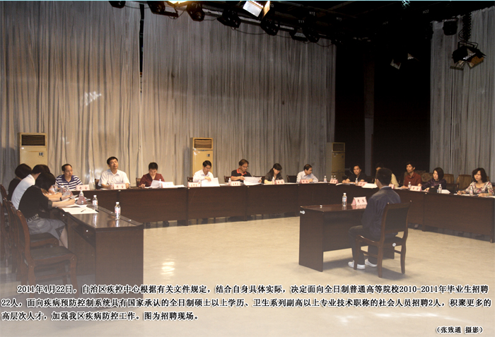 2011年4月22日,自治区疾病预防控制中心根据有关文件规定,结合自身具体实际,决定面向全日制普通高等院校2010-2011年毕业生招聘22人,面向疾病预防控制系统具有国家承认的全日制硕士以上学历、卫生系列副高以上专业技术职称的社会人员招聘2人,积聚更多的高层次人才,加强我区疾病防控工作。