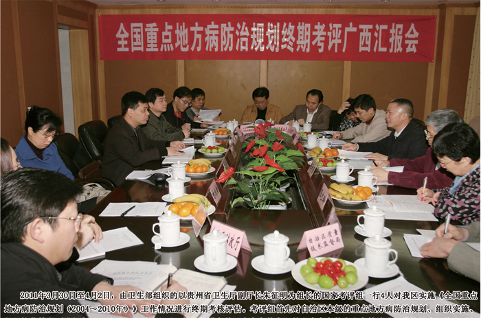 2011年3月30日 到4月2日,由卫生 部组织的以贵州省卫生 厅副厅长朱征明为组长的国家考评组一行4人对我区实施《全国重点地方病防治规划(2004-2010年)》工作情况进行终期考评评估。考评组首先对自治区本级的重点地方病防治规划、组织实施、部门协作等方面进行考评。随后,分别抽取了博白县、宾阳县和合山市等地进行碘缺乏病、饮水型氟中毒、燃煤型氟中毒等防治工作进行现场考评。自治区卫生厅副厅长梁远、疾控处副处长黎火佳、调研员林桂新、区疾控中心副主任赵鹏等同考评组进行现场考评。在反馈会上,考评组一致认为广西全面完成了《规划》要求的各项任务,为下一步做好地方病防治工作奠定了良好基础,防病效果将逐步得到巩固和体现。