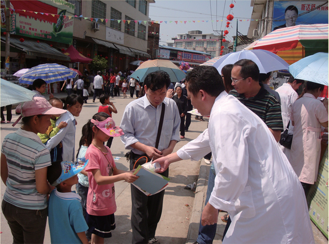 5月26日 融水第十九届花炮节上,自治县卫生局组织医疗卫生单位30多名医务人员开展卫生宣传活动。