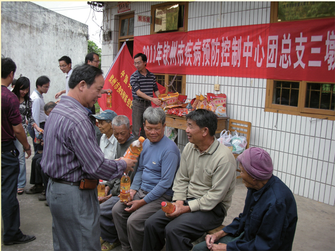 2011年5月4日 ,为纪念“五四”运动92周年,钦州市疾控中心团支部前往三墩岛看望“麻风岛”的孤寡老人,共青团员踊跃捐款给老人购买生活用品和常用药品。