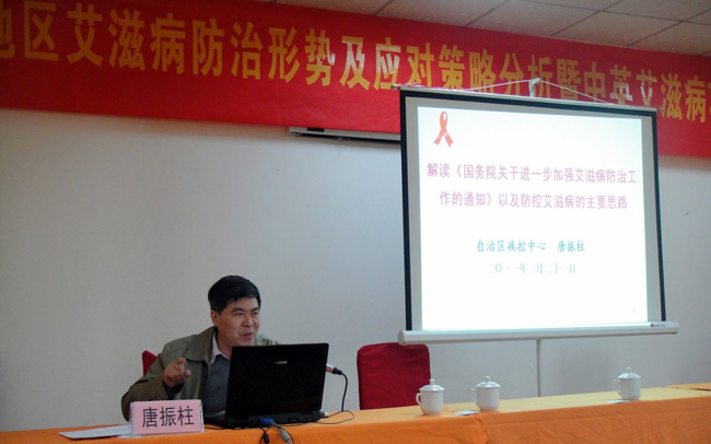 唐振柱主任在会上对百色市防艾工作所取得的成绩以及工作亮点表示肯定;在会上他详细解读了新近下发的《国务院关于进一步加强艾滋病防治工作的通知》(下称《通知》),对《通知》出台的背景和重要意义进行了讲解,结合广西实际对《通知》中17条内容逐一进行解读。随后唐主任介绍了我区艾防工作中阳性配偶/性伴告知、低档暗娼及其服务人群中高传播性、医疗机构筛检阳性标本转介中失访、失检等7个突出问题及可行的破解之道。在会上,他还介绍了2011年区疾控中心艾防工作的主要思路,指出:(1)要继续开展分片指导工作,区疾控中心要派出中层干部或者技术骨干到重点县挂职或蹲点;(2)发挥技术支撑的作用,为卫生行政部门起草若干规范性文件,扩大监测,完善转介机制,最大限度发现传染源;(3)派出不少于500人天到重点县、乡、村蹲点调研指导,指导建立县-乡-村防艾新模式,推动艾防工作的重心下沉、关口前移;(4)启动和实施30-50名以上公共卫生专家深入重点乡镇、村开展200场以上防艾科普及防艾政策宣讲行动,带动全区各级疾控中心实施千场宣讲活动,提高宣传力度和效果,树立疾控中心防艾主力军的良好形象;(5)加强培训,提高随访工作人员的咨询水平,提升对感染者和病人的随访管理和阳性告知的技巧;(6)在部分重点县探讨对重点服务人员开展定期健康体检的工作新机制,降低暗娼的传播;(7)加强专项调查和科学研究,注重科技成果的转化为生产力,提高防治能力和水平等。