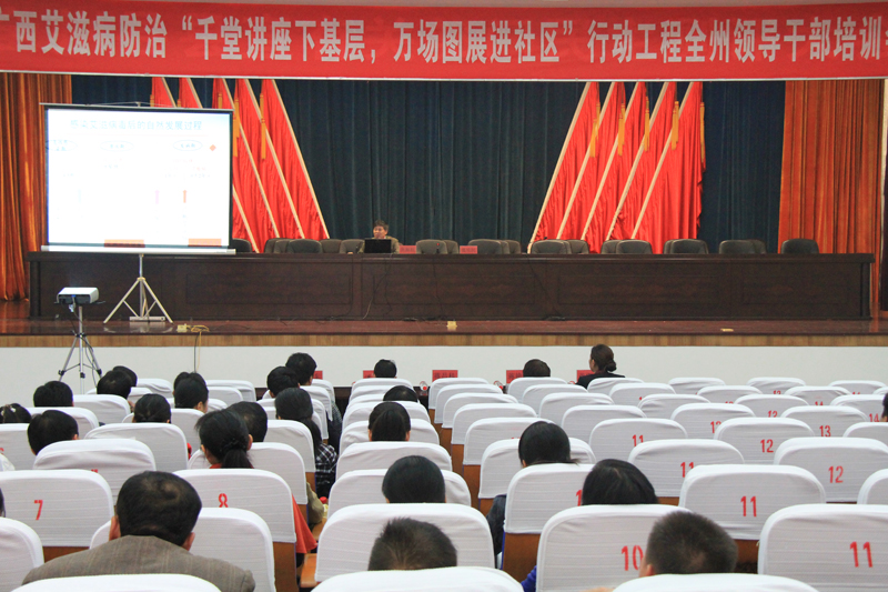 唐振柱主任根据当前全区艾防形势结合全州县情况,从艾滋病的病原学、传播途径、流行形势及危害、大众防治知识、国家防治政策及国内外艾滋病研究最新进展等方面,用大量真实的图片并文字相结合的方式,举了多个老百姓身边的实例,使讲座通俗易懂。唐主任用动情的声音呼吁全县领导干部行动起来关注艾滋病,勉励了他们引以为戒、警钟长鸣、洁身自好,关爱和帮助艾滋病患者,积极参与到防治艾滋病的工作中,打赢遏制艾滋病的攻坚战。此次活动还给到场听众赠送了包括环保袋、宣传单、宣传手册、安全套等“小礼物”,充分调动了干部群众参与防艾的积极性。