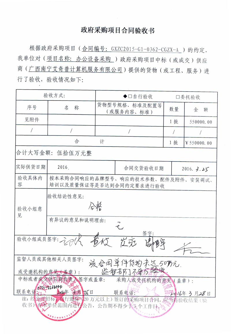 根据《广西壮族自治区政府采购项目履约验收管理办法》(桂财采〔2015〕22号 )的文件要求,现将合同名称:专用设备采购(GXZC2015-G1-0362-CGZX-A)的验收情况公告如下: