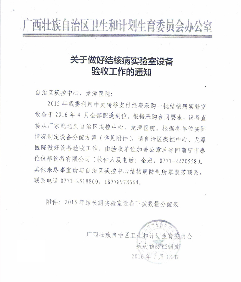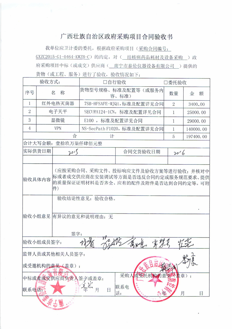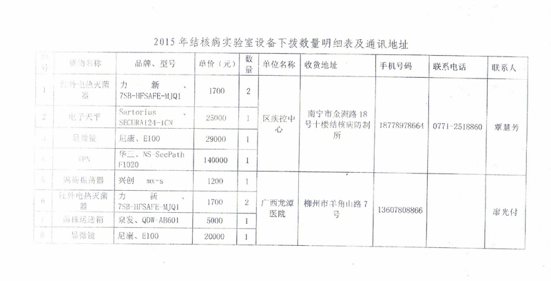 应卫计委的委托,根据《广西壮族自治区政府采购项目履约验收管理办法》(桂财采〔2015〕22号 )的文件要求,现将合同名称:结核病药品耗材及设备采购(GXZC2015-G1-0464-KWZB-C)下拨至我中心的设备验收情况公告如下: