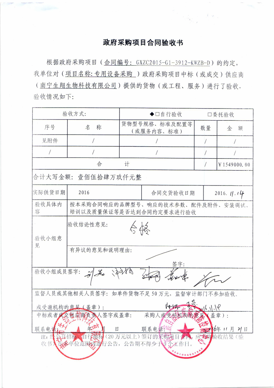 根据《广西壮族自治区政府采购项目履约验收管理办法》(桂财采〔2015〕22号 )的文件要求,现将合同名称:专用设备采购(GXZC2015-G1-3912-KWZB-D)的验收情况公告如下: