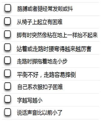 - 动作迟缓:上下床、站立或坐下等动作都须费点劲才能做到。