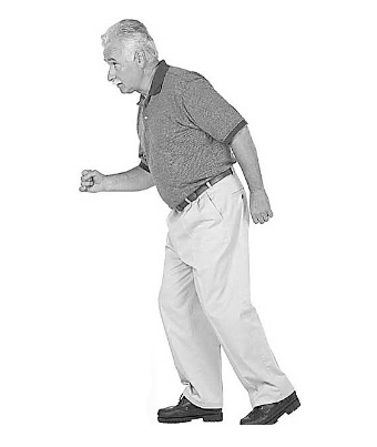 - 步态障碍:往往从一侧开始拖着下肢行走,后累及对侧;起步困难,不能迈步,双脚像粘在地面上,一旦迈步,即以极小的步伐向前冲去,越走越快,不能及时停步或转身困难。