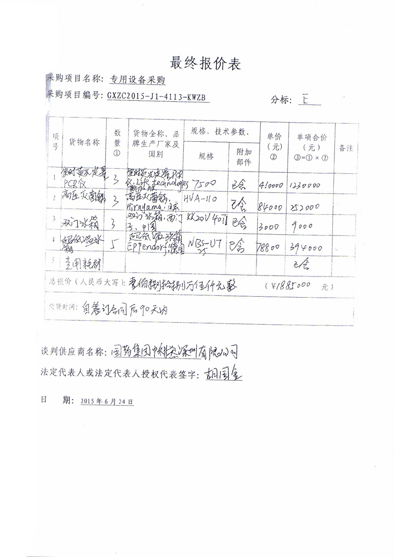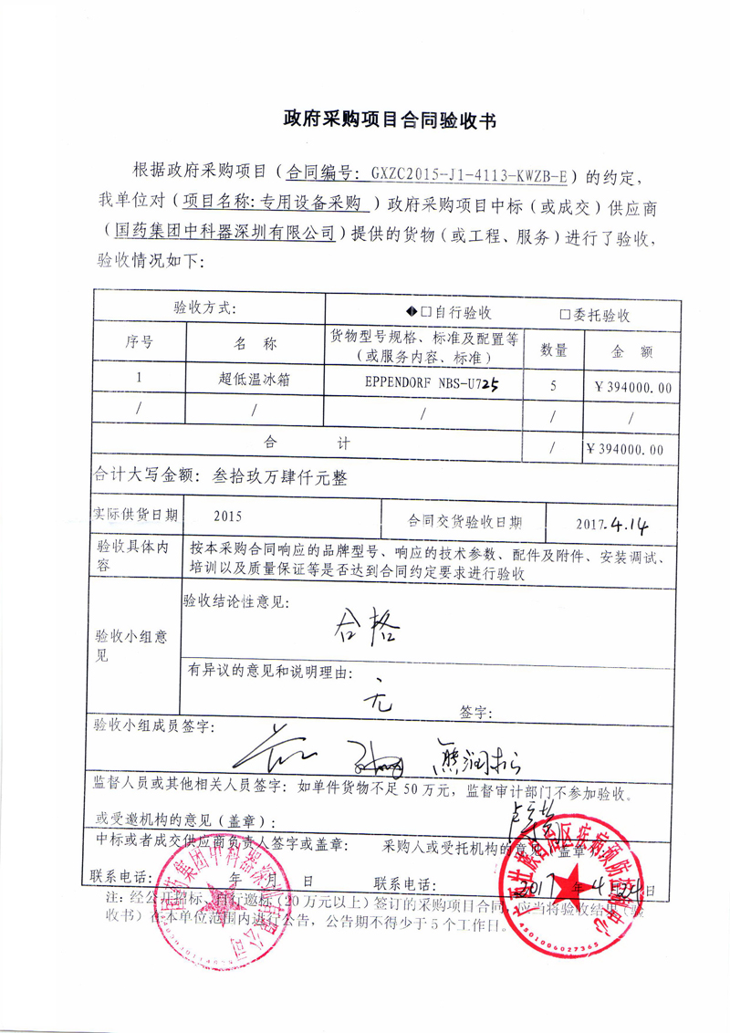 根据《广西壮族自治区政府采购项目履约验收管理办法》(桂财采〔2015〕22号 )的文件要求,现将合同名称:专用设备采购(GXZC2015-J1-4113-KWZB-E)的验收情况公告如下: