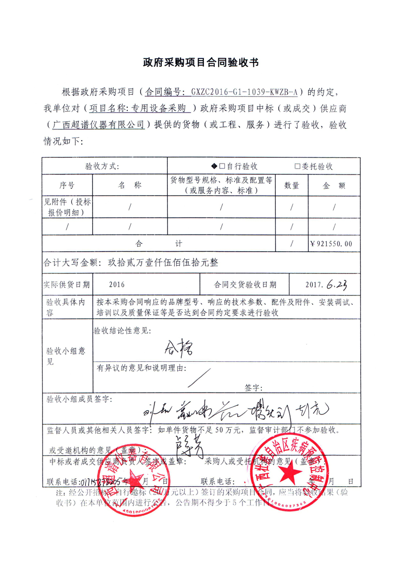 根据《广西壮族自治区政府采购项目履约验收管理办法》(桂财采〔2015〕22号 )的文件要求,现将合同名称:专用设备及软件开发服务(GXZC2016-G1-1039-KWZB-A)的验收情况公告如下: