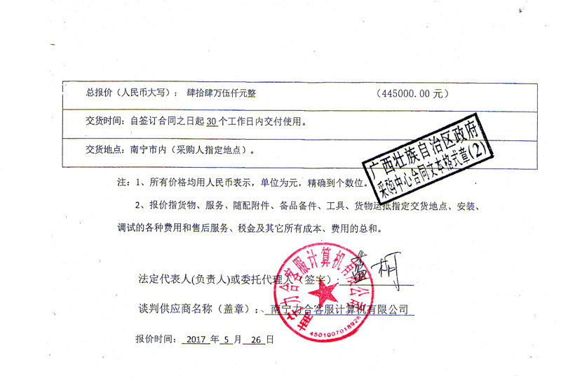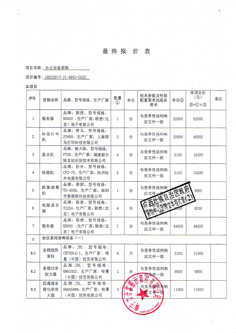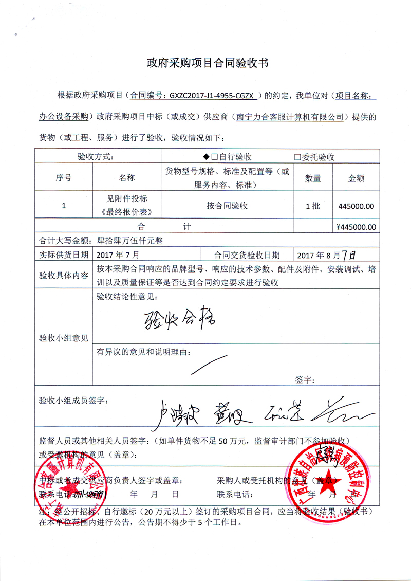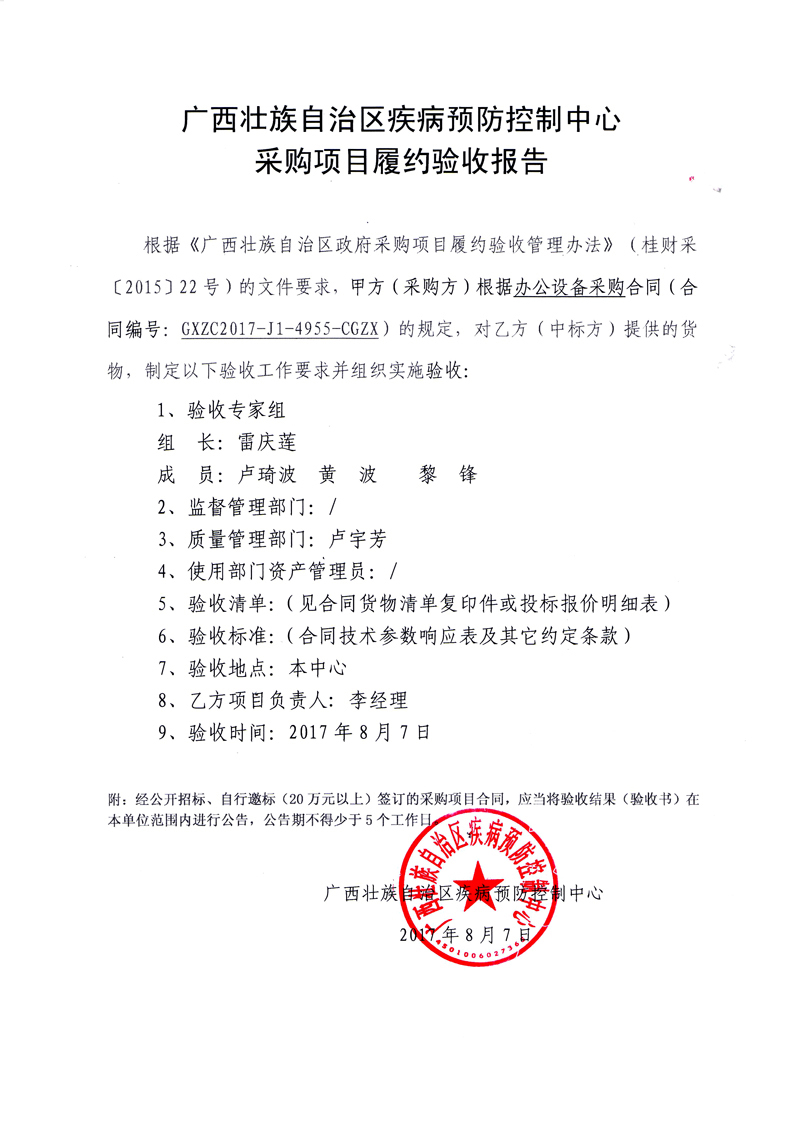 根据《广西壮族自治区政府采购项目履约验收管理办法》(桂财采〔2015〕22号 )的文件要求,现将合同名称:办公设备采购(GXZC2017-J1-4955-CGZX)的验收情况公告如下: