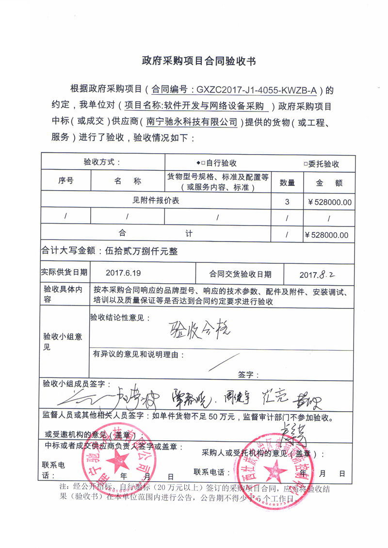 根据《广西壮族自治区政府采购项目履约验收管理办法》(桂财采〔2015〕22号 )的文件要求,现将合同名称:专用设备及软件开发服务(GXZC2017-J1-4055-KWZB-A)的验收情况公告如下:
