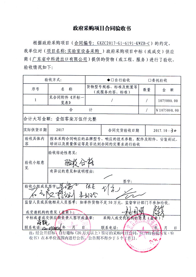 根据《广西壮族自治区政府采购项目履约验收管理办法》(桂财采〔2015〕22号 )的文件要求,现将合同名称:实验室设备采购(GXZC2017-G1-6191-KWZB-C)的验收情况公告如下: