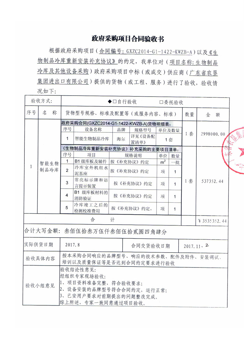 根据《广西壮族自治区政府采购项目履约验收管理办法》(桂财采〔2015〕22号 )的文件要求,现将合同名称:生物制品冷库及其他设备采购合同以及生物制品冷库重新安装补充协议(GXZC2014-G1-1422-KWZB-A)的验收情况公告如下: