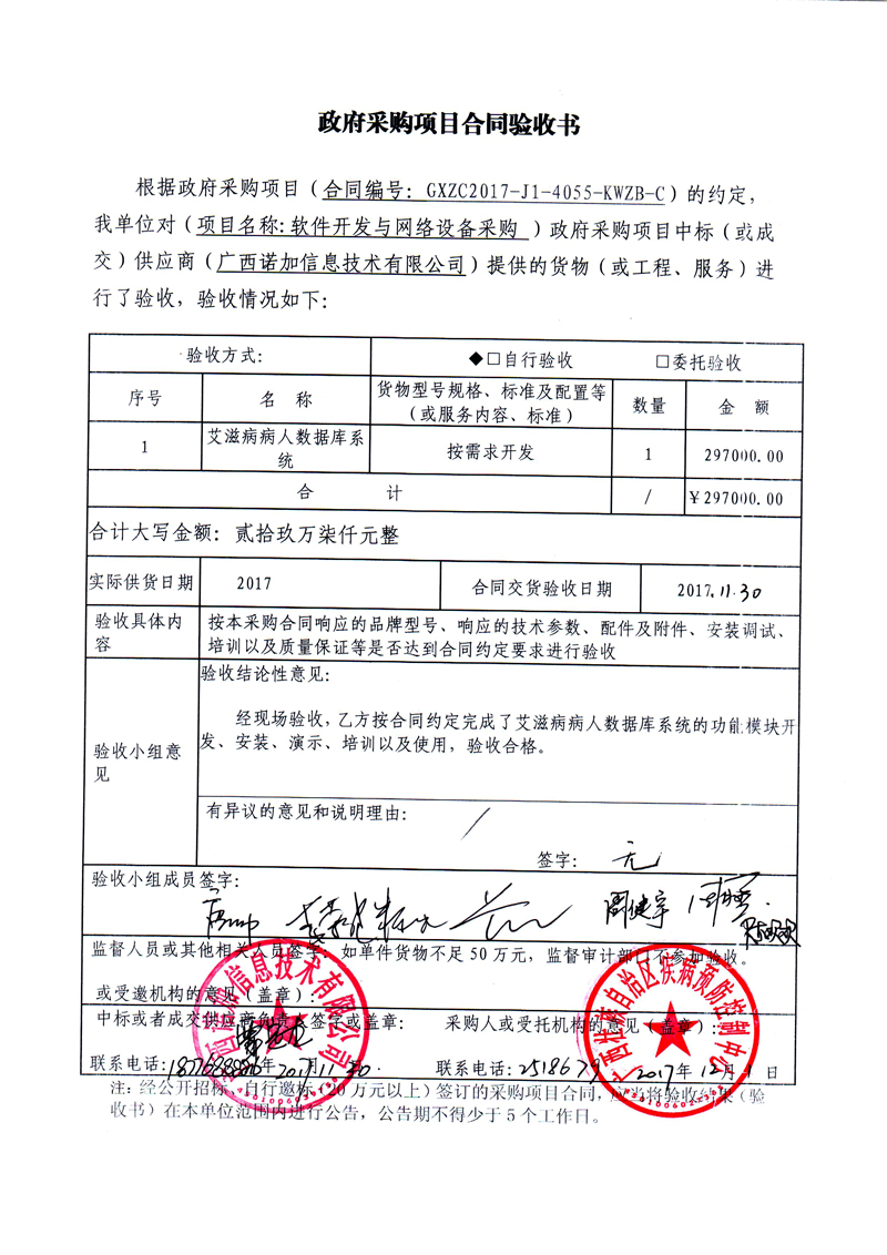根据《广西壮族自治区政府采购项目履约验收管理办法》(桂财采〔2015〕22号 )的文件要求,现将合同名称: 专用设备及软件开发服务(GXZC2017-J1-4055-KWZB-C)的验收情况公告如下: