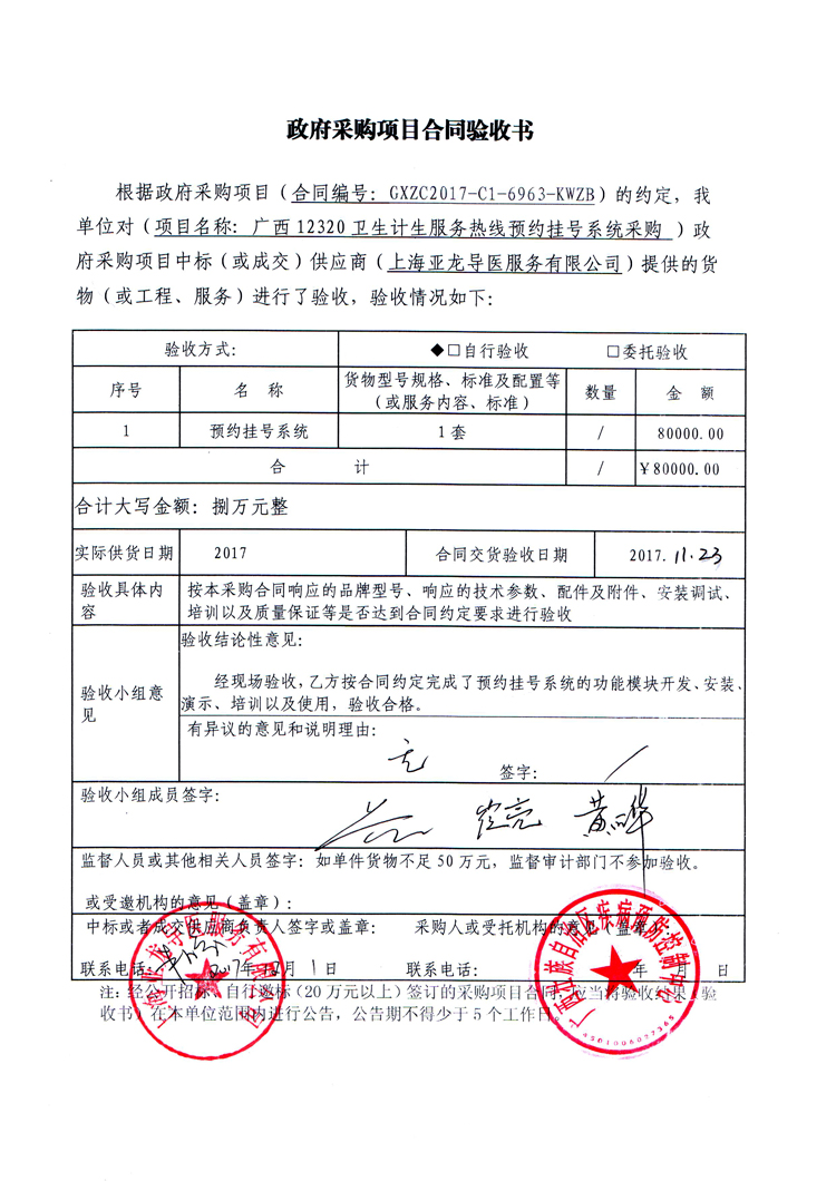 根据《广西壮族自治区政府采购项目履约验收管理办法》(桂财采〔2015〕22号 )的文件要求,现将合同名称:广西12320卫生计生服务热线预约挂号系统采购(GXZC2017-G1-6963-KWZB)的验收情况公告如下: