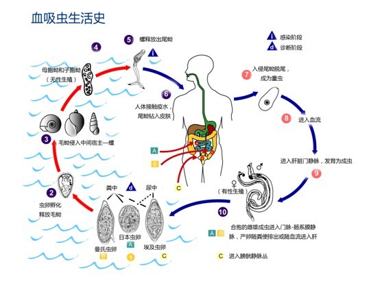 在人体内,尾蚴发展为成虫。成虫寄生在血管中,雌虫在血管中产卵。一些虫卵随粪便或尿液排出体外,继续其寄生虫生命周期。其它虫卵则困在人体组织内,引起免疫反应,并逐渐损害人体器官(图2)。