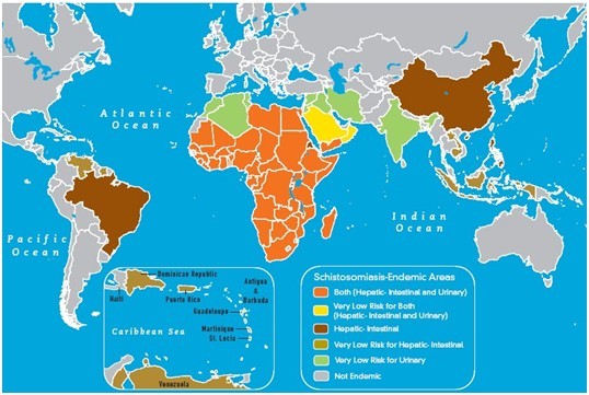 血吸虫病流行于热带和亚热带地区,在无法获得安全饮水和缺乏适当环卫设施的贫穷社区尤为严重。估计至少90%需要得到血吸虫治疗的患者生活在非洲(图3)。
