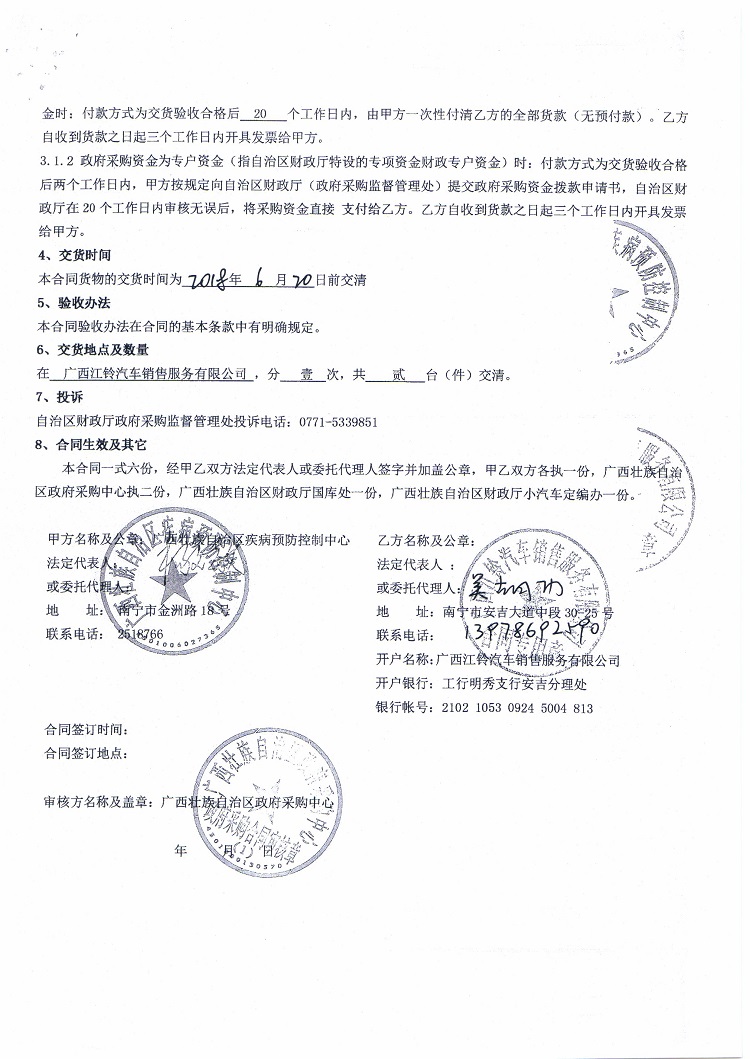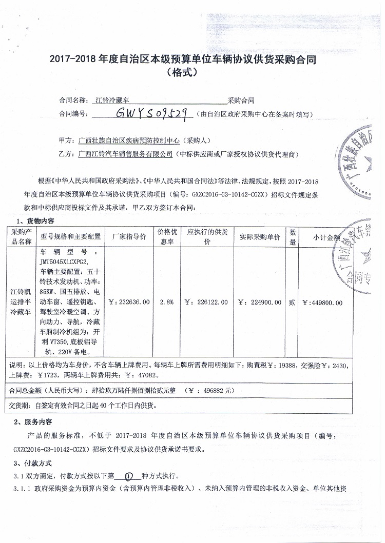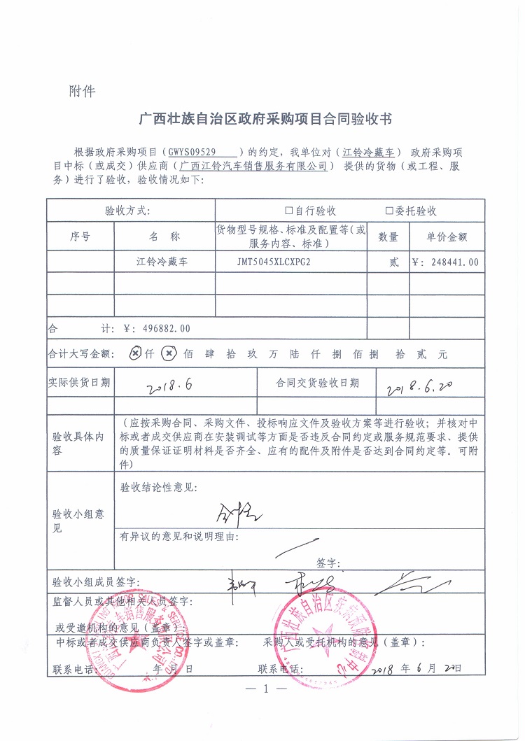 根据《广西壮族自治区政府采购项目履约验收管理办法》(桂财采〔2015〕22号 )的文件要求,现将合同名称:江铃冷藏车(GWYS09529)的验收情况公告如下: