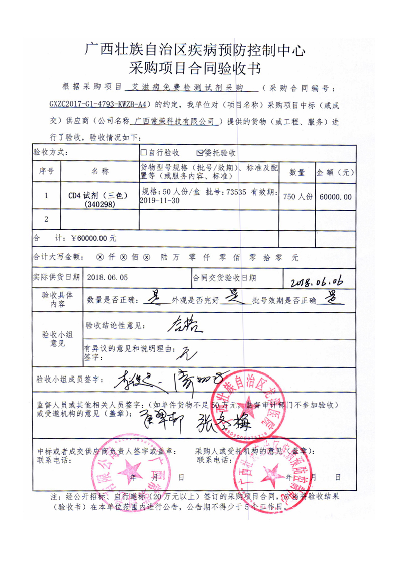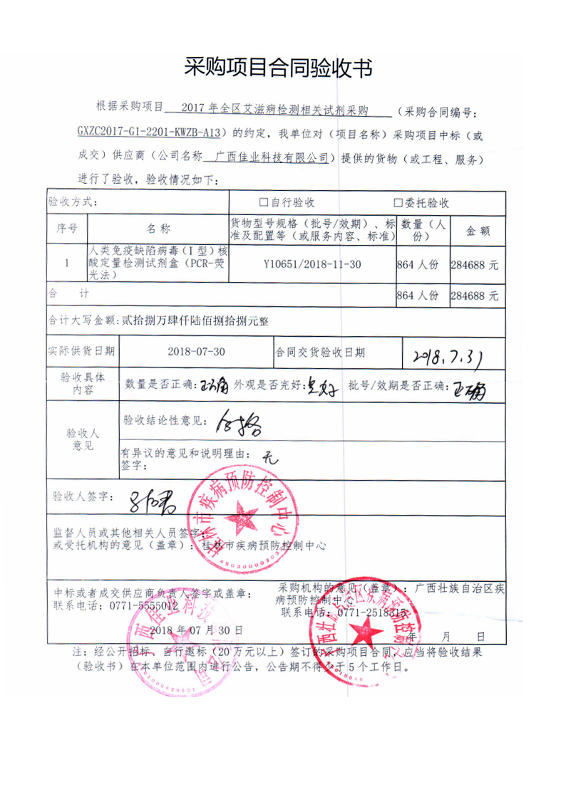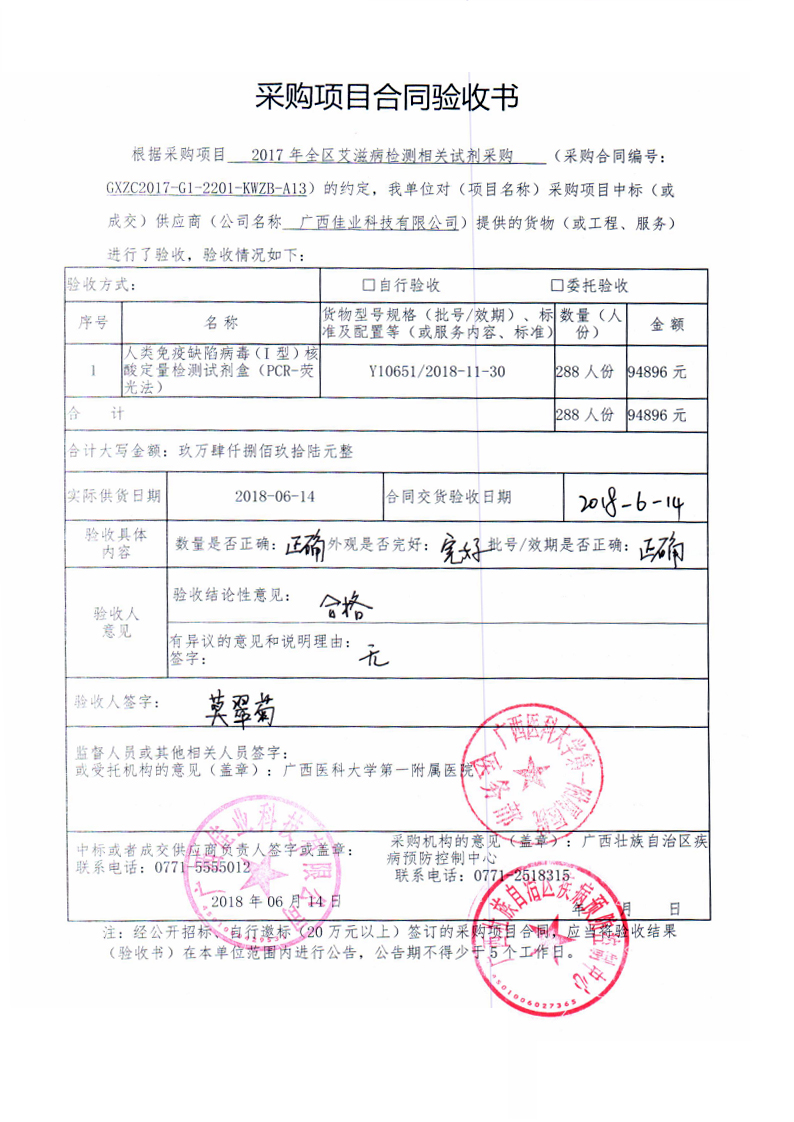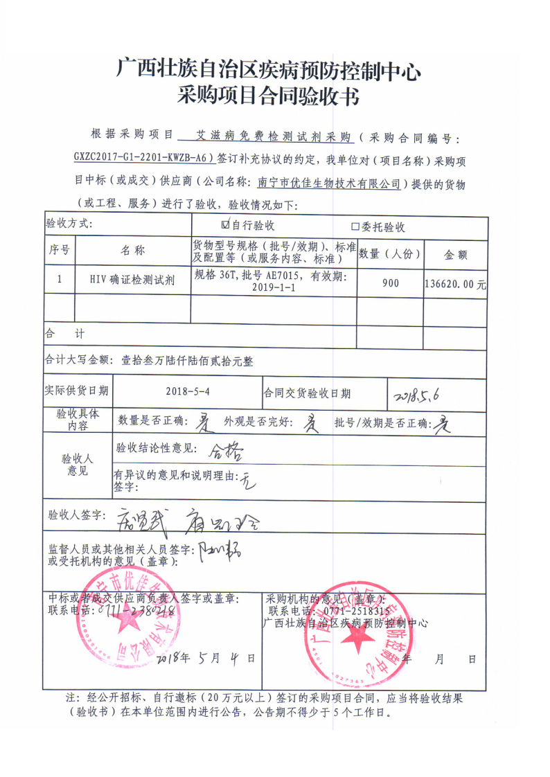 根据《广西壮族自治区政府采购项目履约验收管理办法》(桂财采〔2015〕22号 )的文件要求,现将合同名称:艾滋病免费检测试剂采购(GXZC2017-G1-2201-KWZB-A13、GXZC2017-G1-2201-KWZB-A6补充协议、GXZC2017-G1-4793-KWZB-A4补充协议、GXZC2017-G1-4793-KWZB-A5补充协议)的验收情况公告如下: