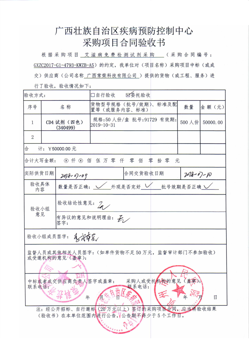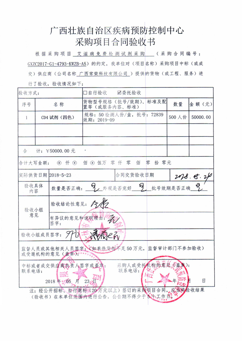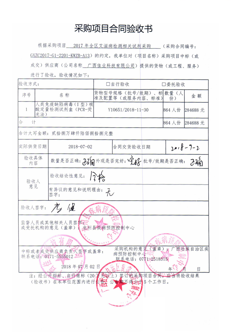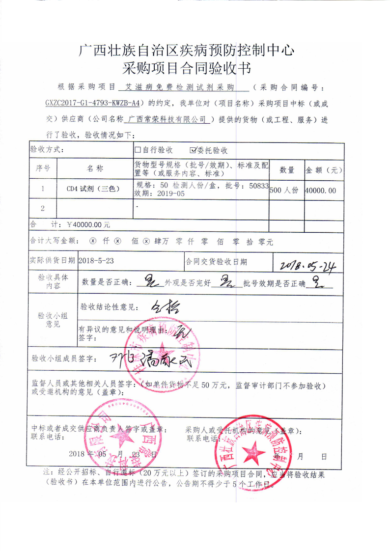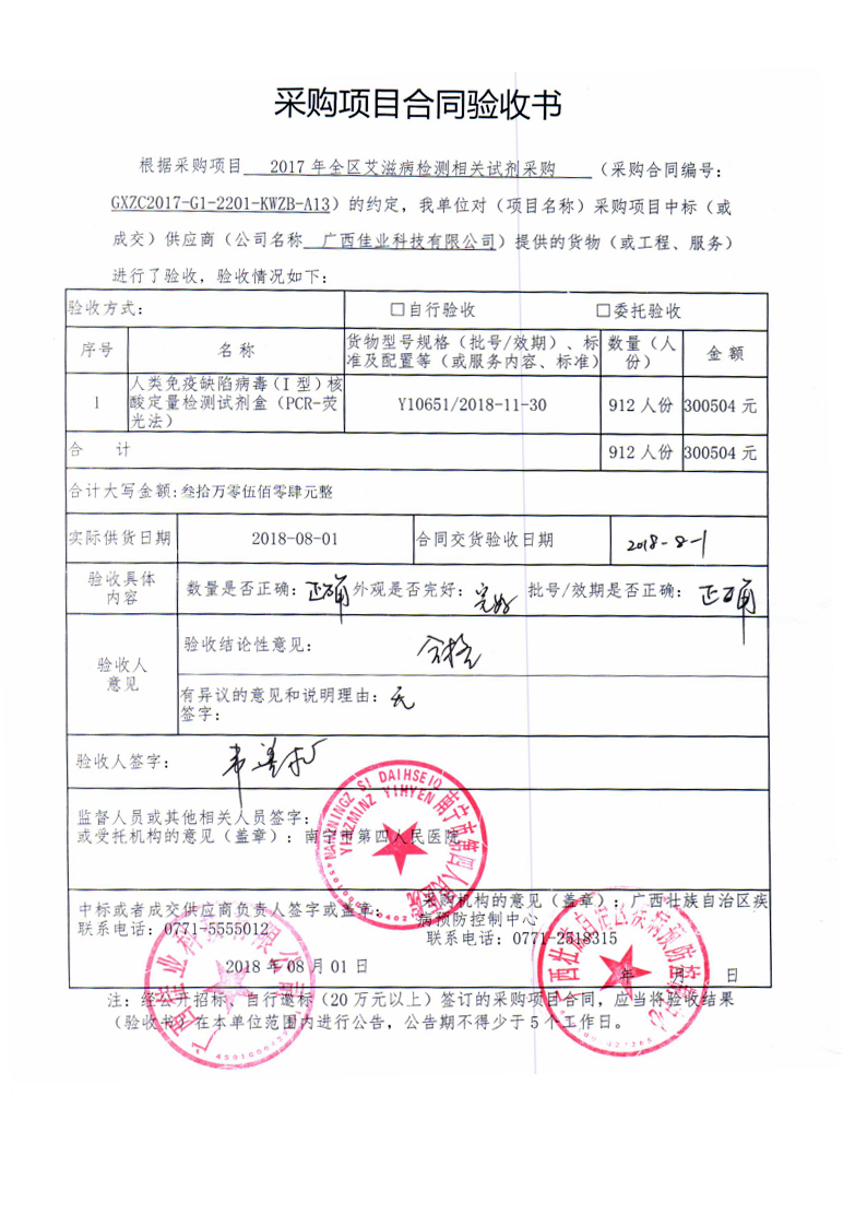 根据《广西壮族自治区政府采购项目履约验收管理办法》(桂财采〔2015〕22号 )的文件要求,现将合同名称:艾滋病免费检测试剂采购(GXZC2017-G1-2201-KWZB-A13、GXZC2017-G1-2201-KWZB-A6补充协议、GXZC2017-G1-4793-KWZB-A4补充协议、GXZC2017-G1-4793-KWZB-A5补充协议)的验收情况公告如下: