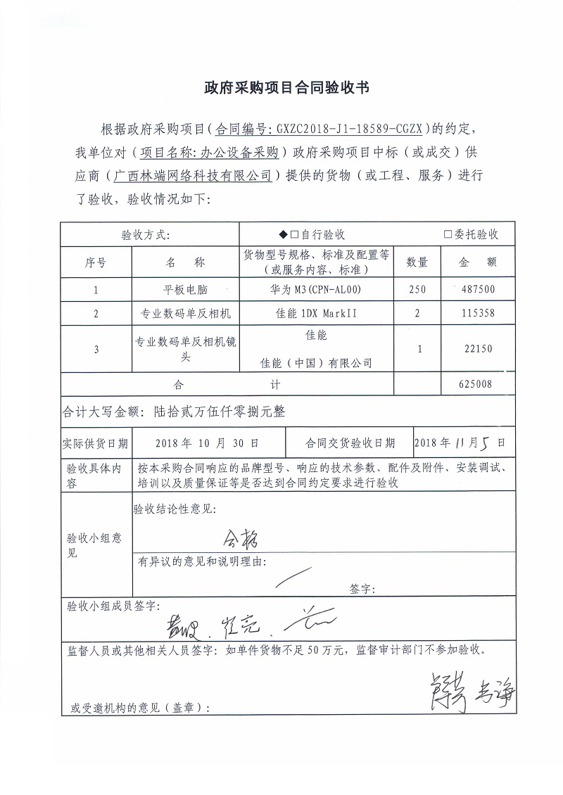 根据《广西壮族自治区政府采购项目履约验收管理办法》(桂财采〔2015〕22号 )的文件要求,现将合同名称:办公设备采购(GXZC2018-J1-18589-KWZB-B)的验收情况公告如下: