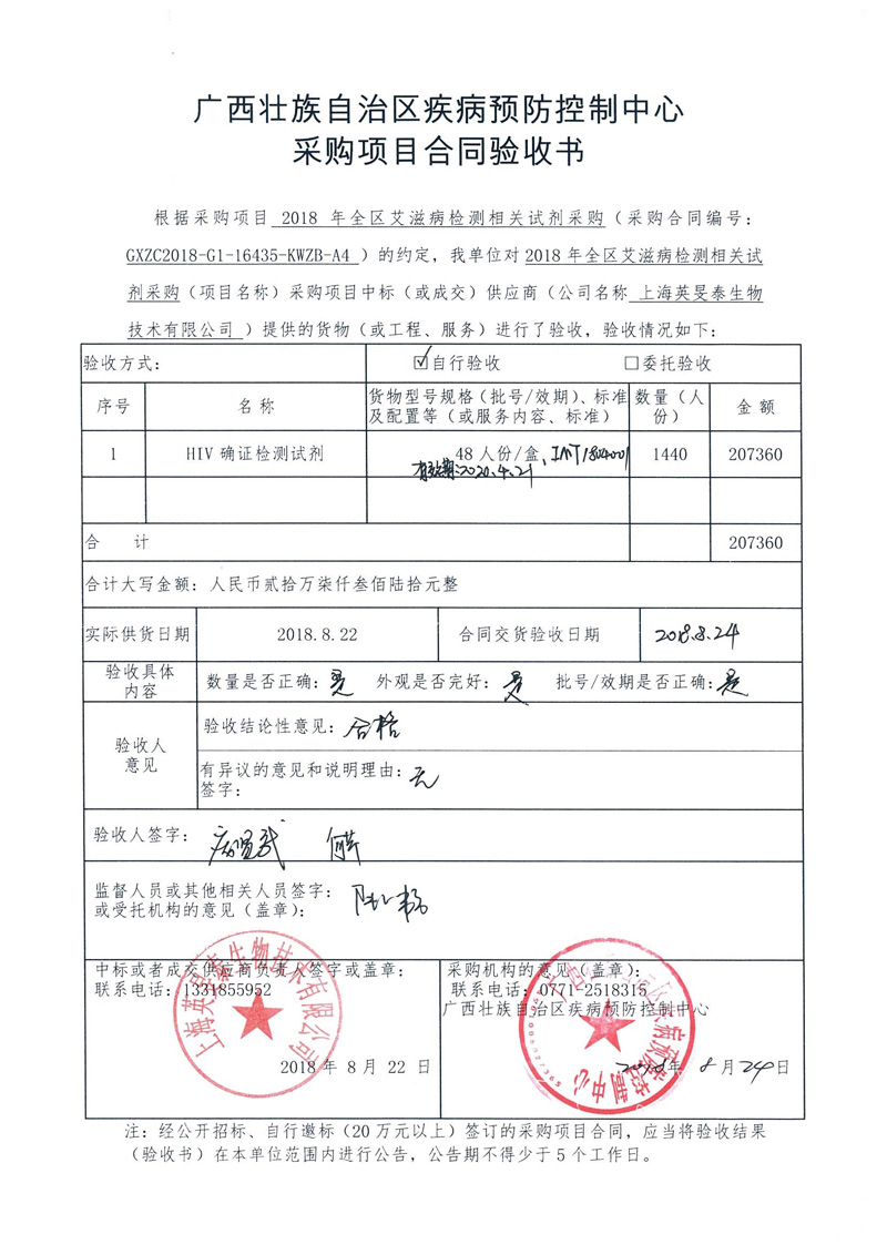 根据《广西壮族自治区政府采购项目履约验收管理办法》(桂财采〔2015〕22号 )的文件要求,现将合同名称:艾滋病免费检测试剂采购(GXZC2018-G1-16435-KWZB-A4)的验收情况公告如下: