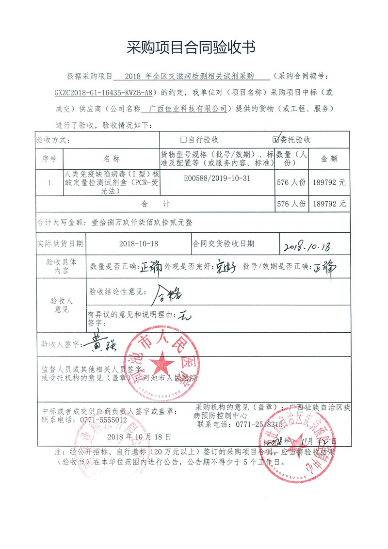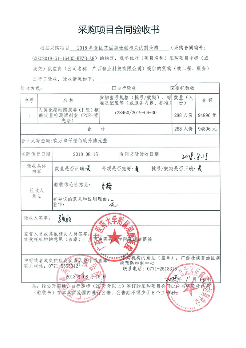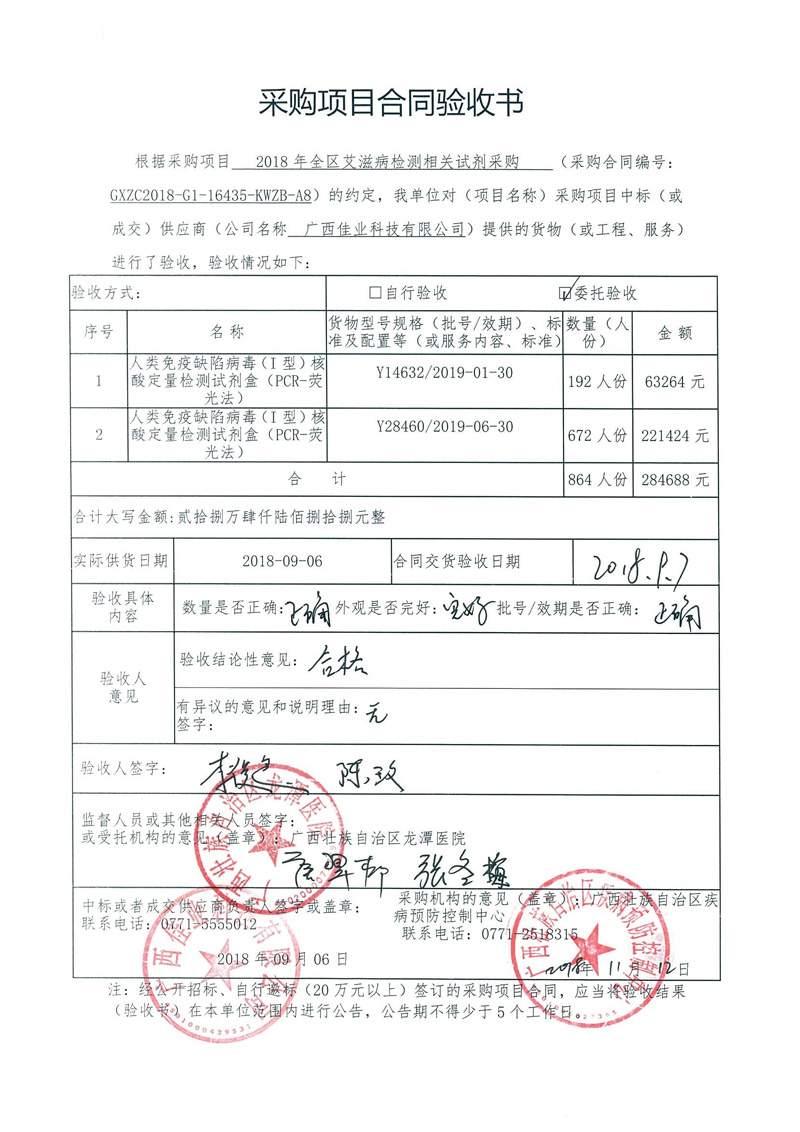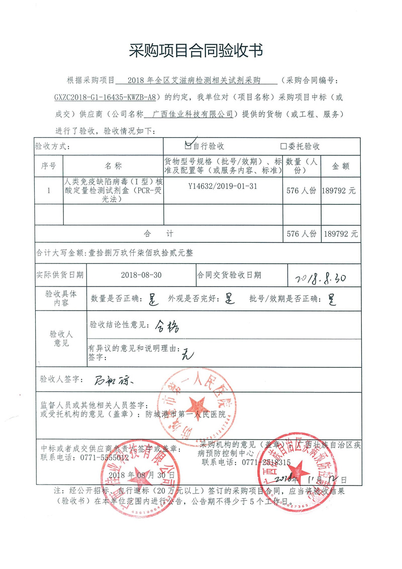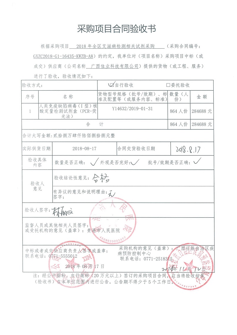 根据《广西壮族自治区政府采购项目履约验收管理办法》(桂财采〔2015〕22号 )的文件要求,现将合同名称:艾滋病免费检测试剂采购(GXZC2018-G1-16435-KWZB-A8)的验收情况公告如下: