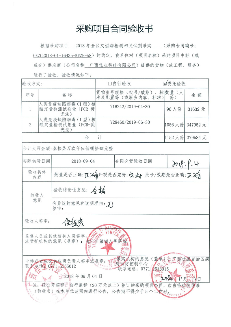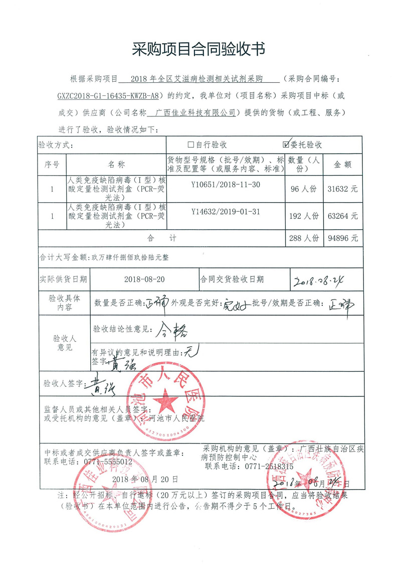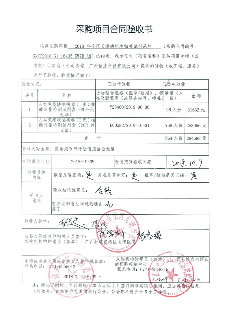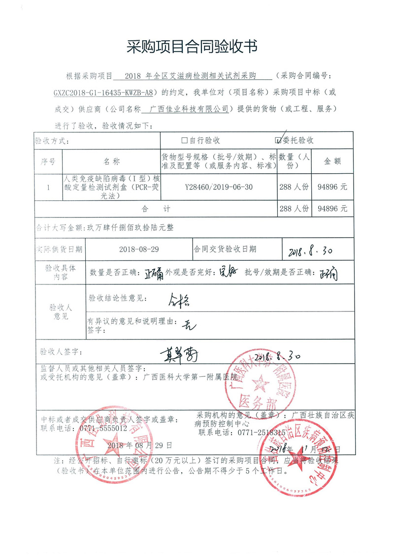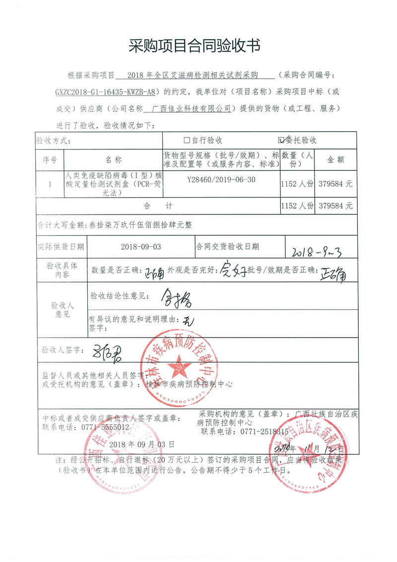 根据《广西壮族自治区政府采购项目履约验收管理办法》(桂财采〔2015〕22号 )的文件要求,现将合同名称:艾滋病免费检测试剂采购(GXZC2018-G1-16435-KWZB-A8)的验收情况公告如下: