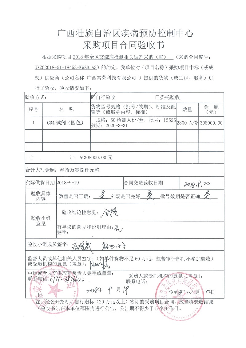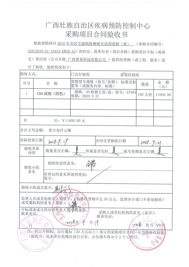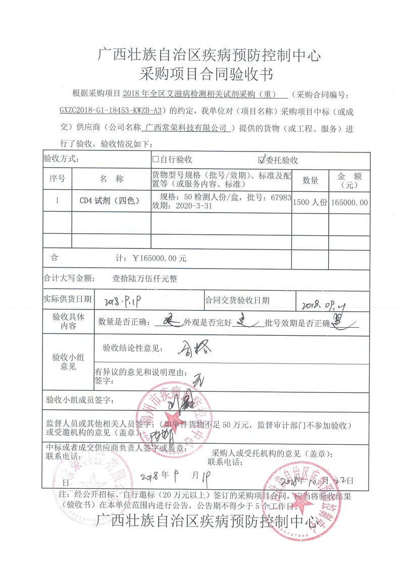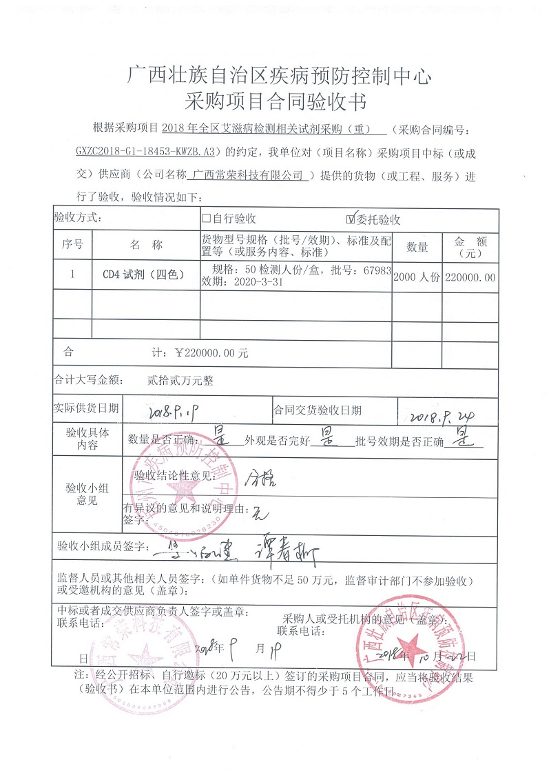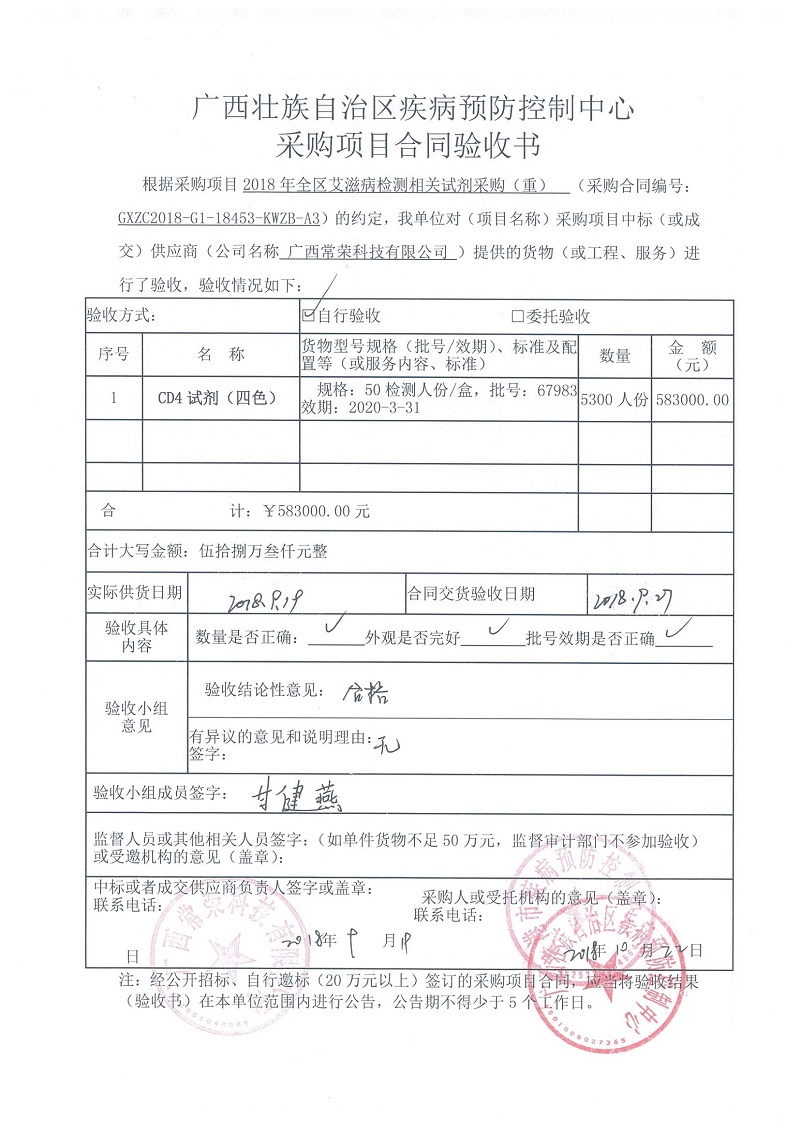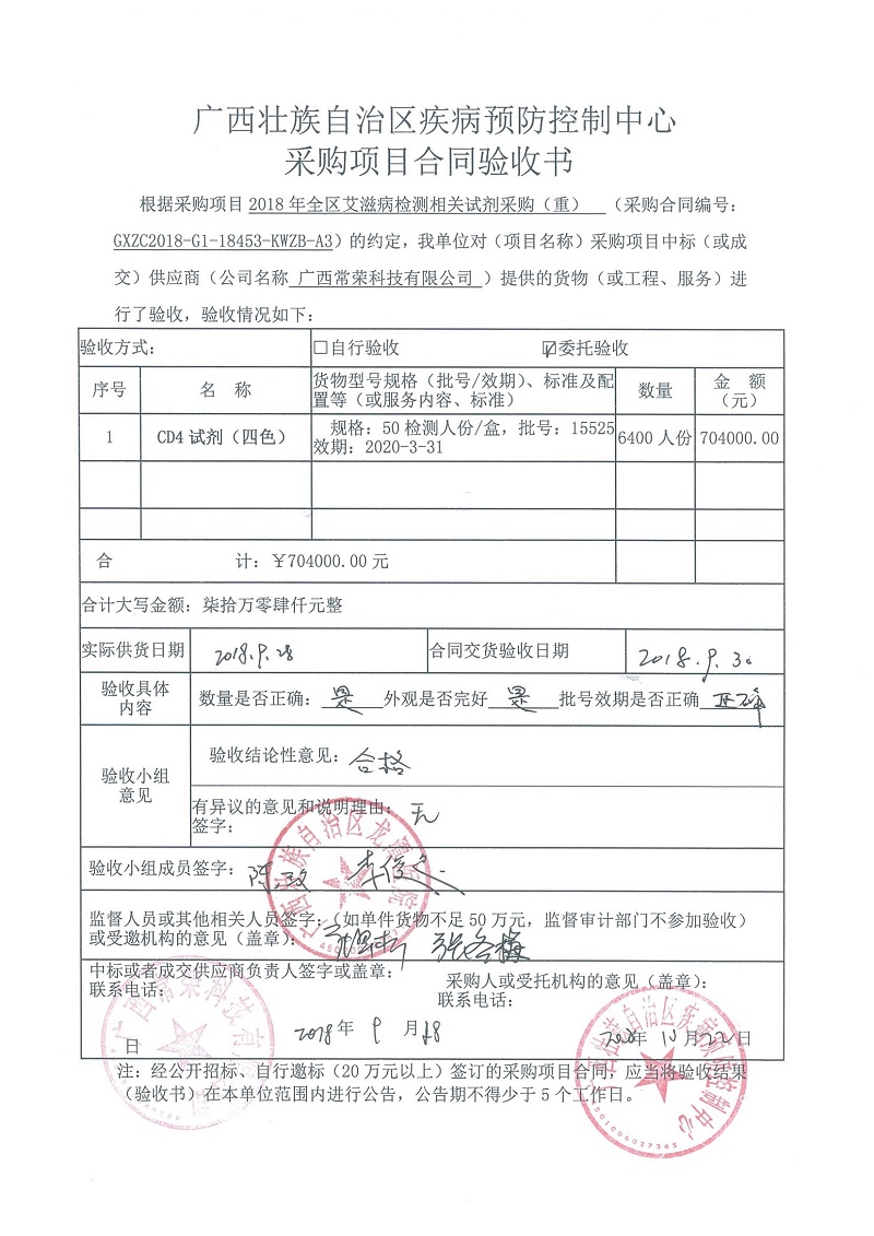 根据《广西壮族自治区政府采购项目履约验收管理办法》(桂财采〔2015〕22号 )的文件要求,现将合同名称:艾滋病免费检测试剂采购(GXZC2018-G1-18453-KWZB-A3)的验收情况公告如下: