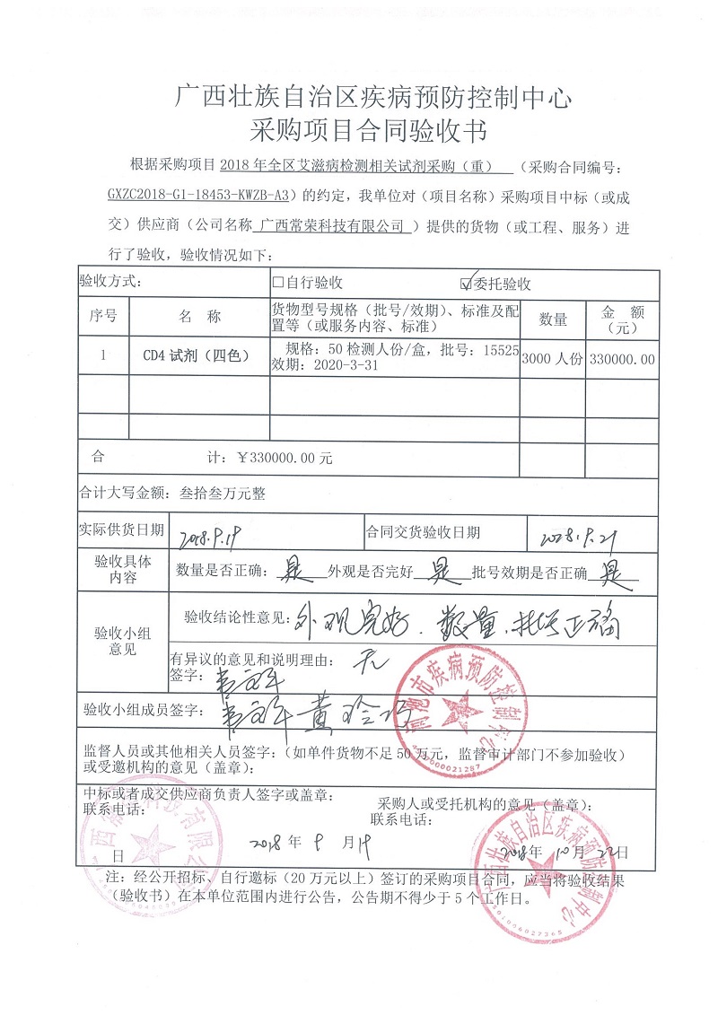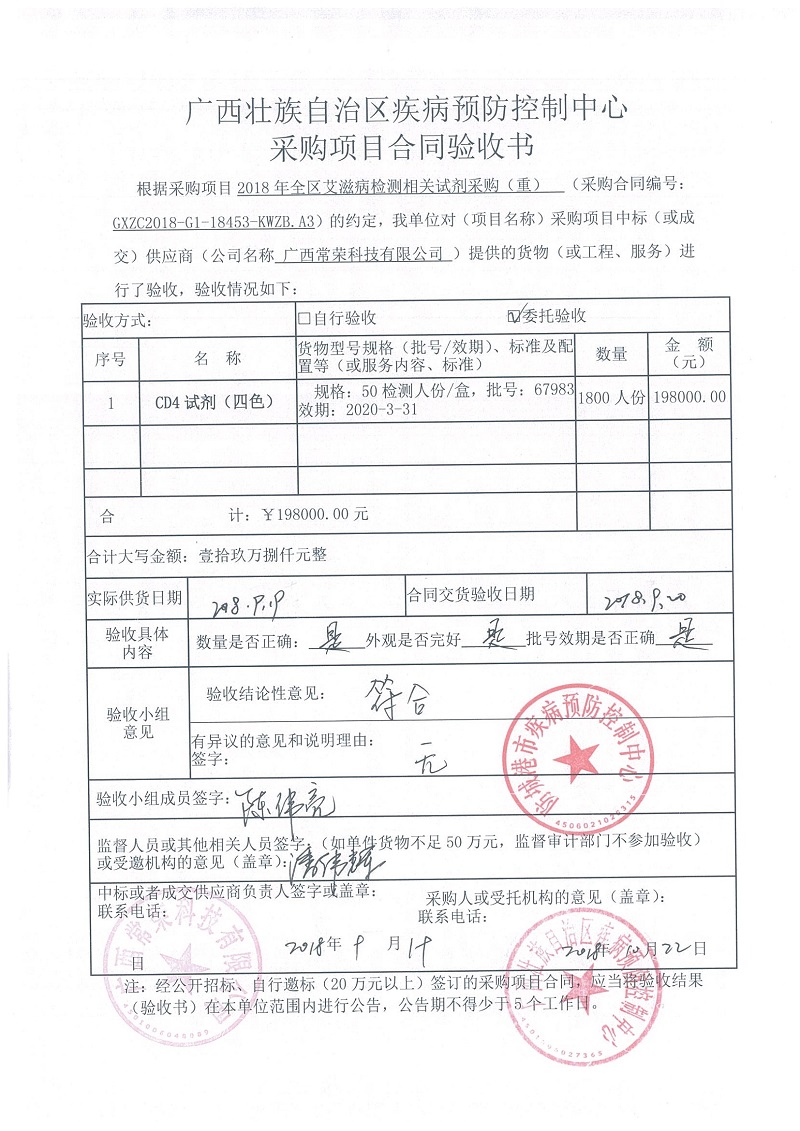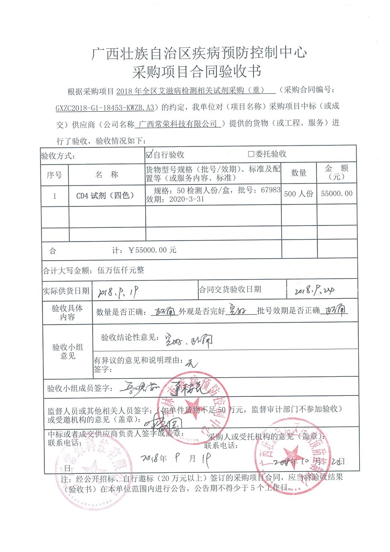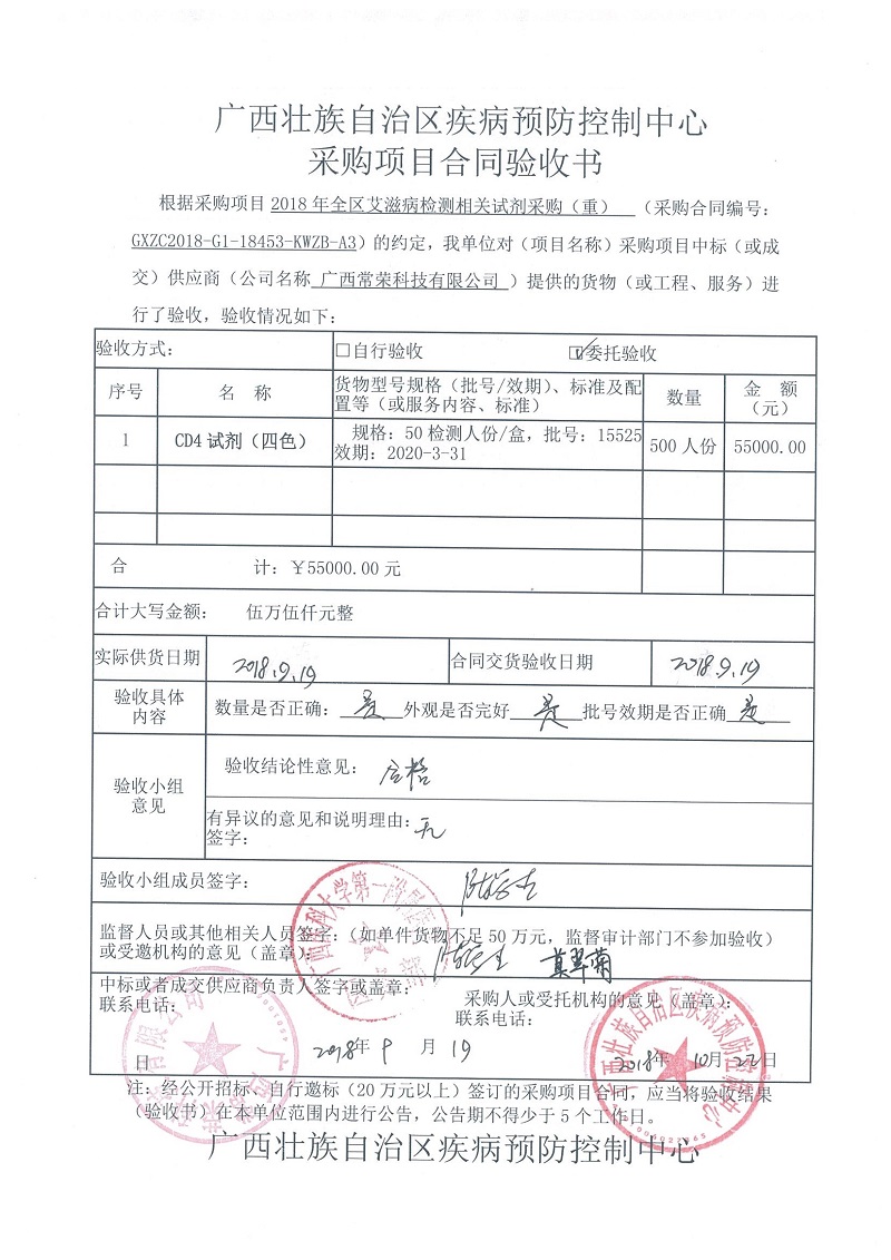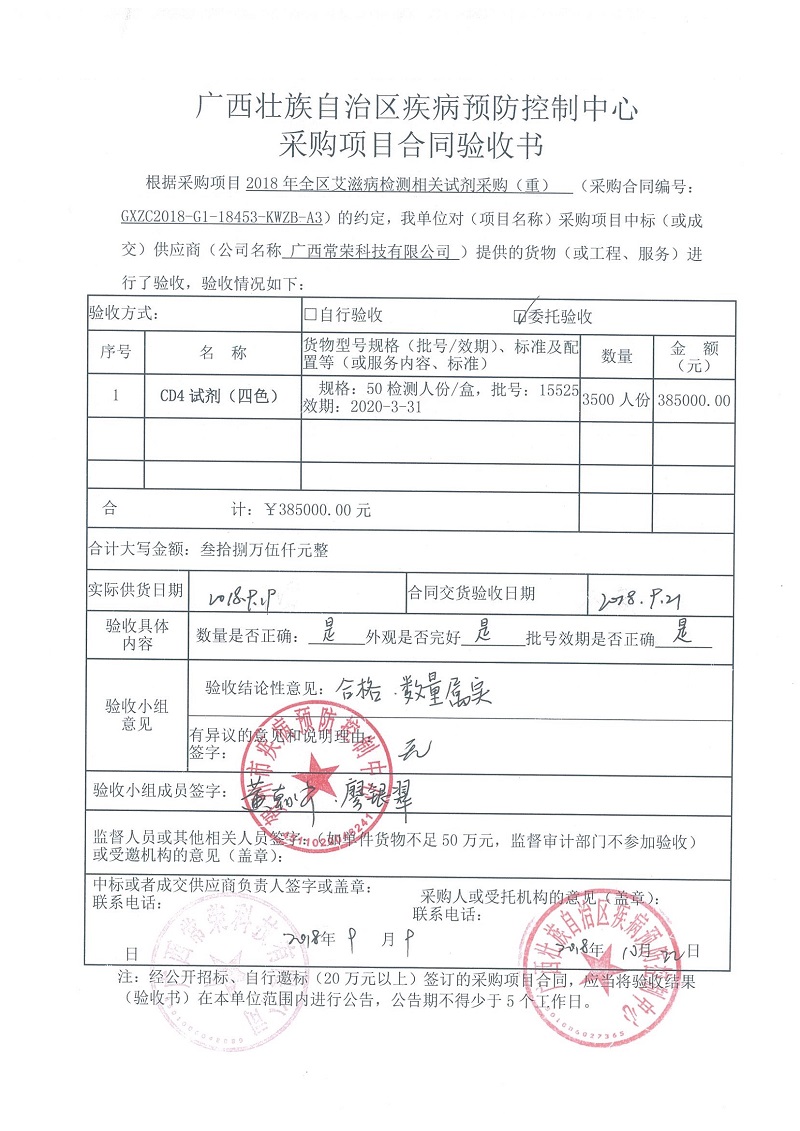 根据《广西壮族自治区政府采购项目履约验收管理办法》(桂财采〔2015〕22号 )的文件要求,现将合同名称:艾滋病免费检测试剂采购(GXZC2018-G1-18453-KWZB-A3)的验收情况公告如下: