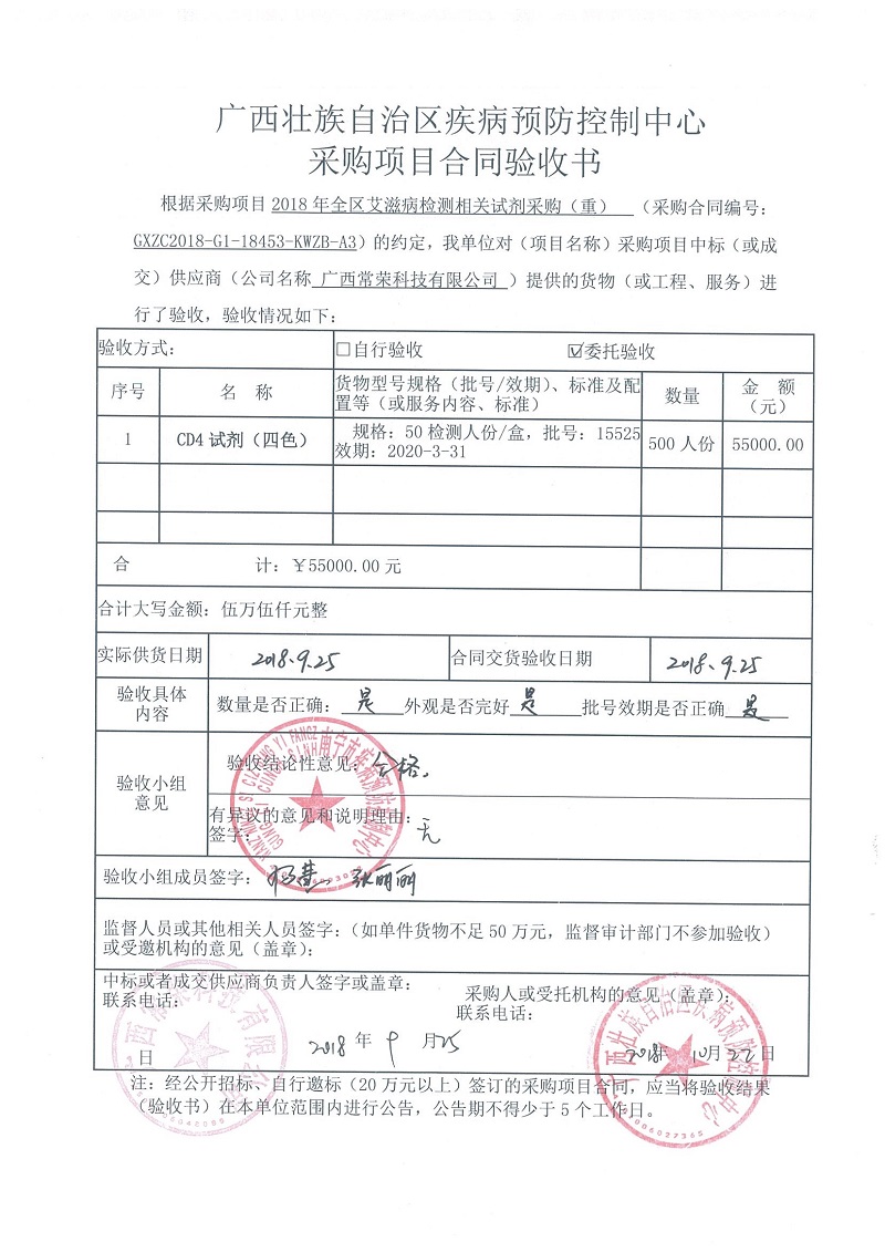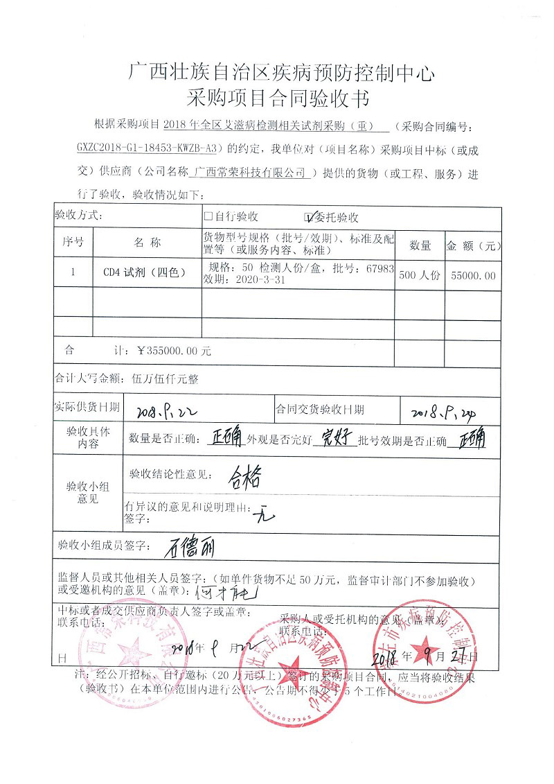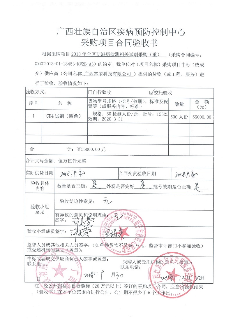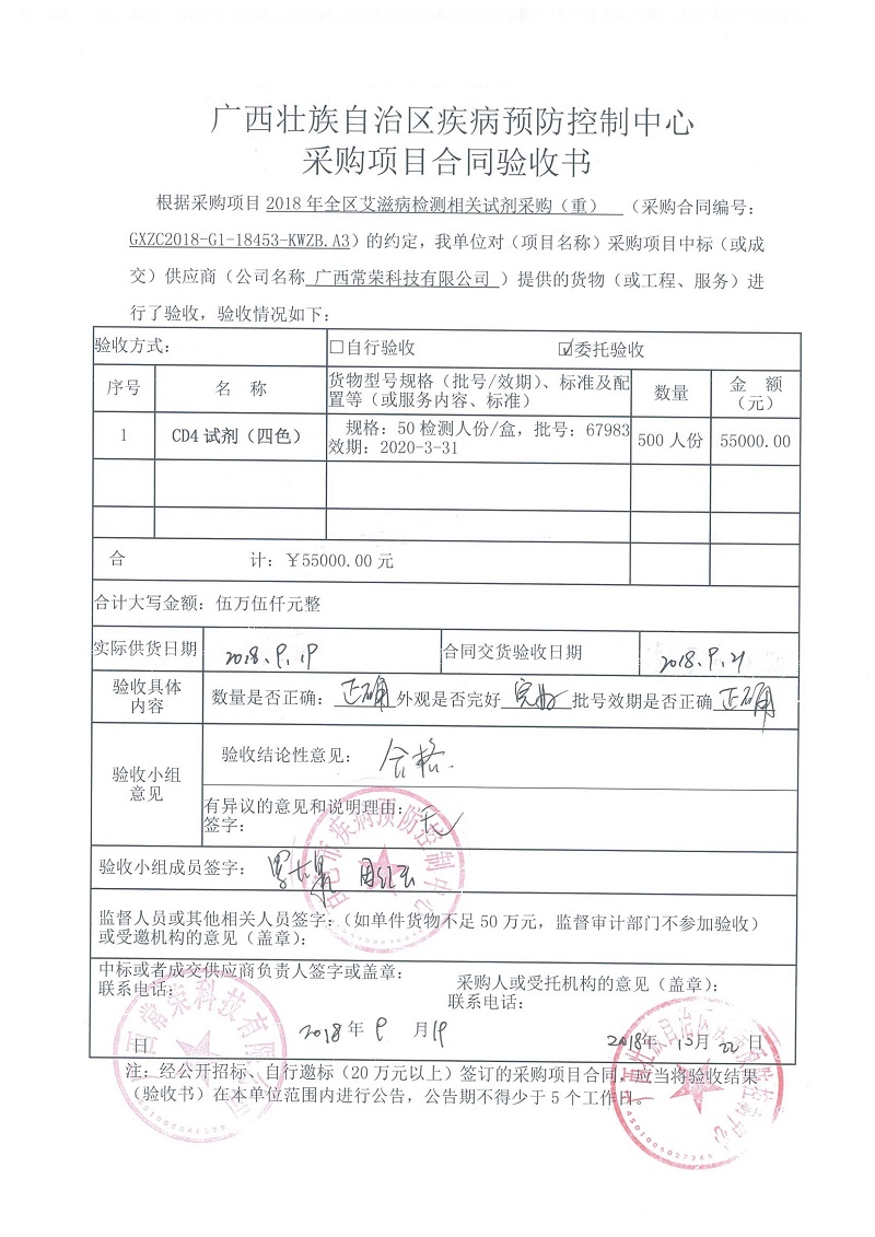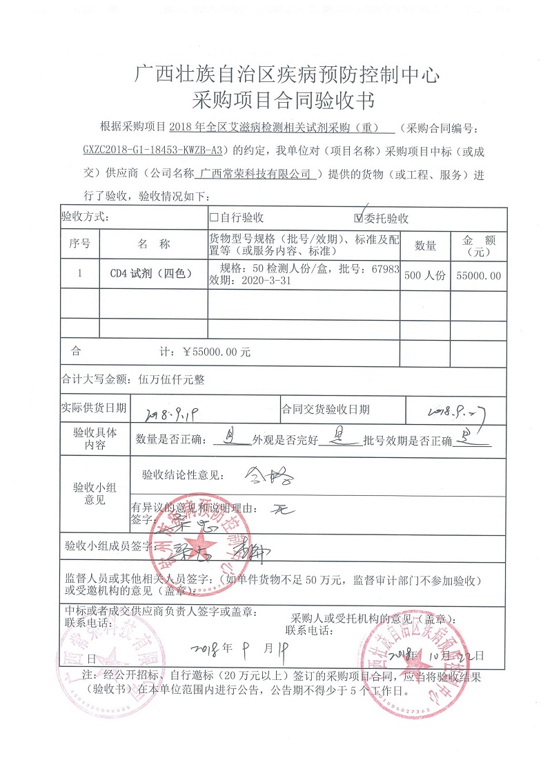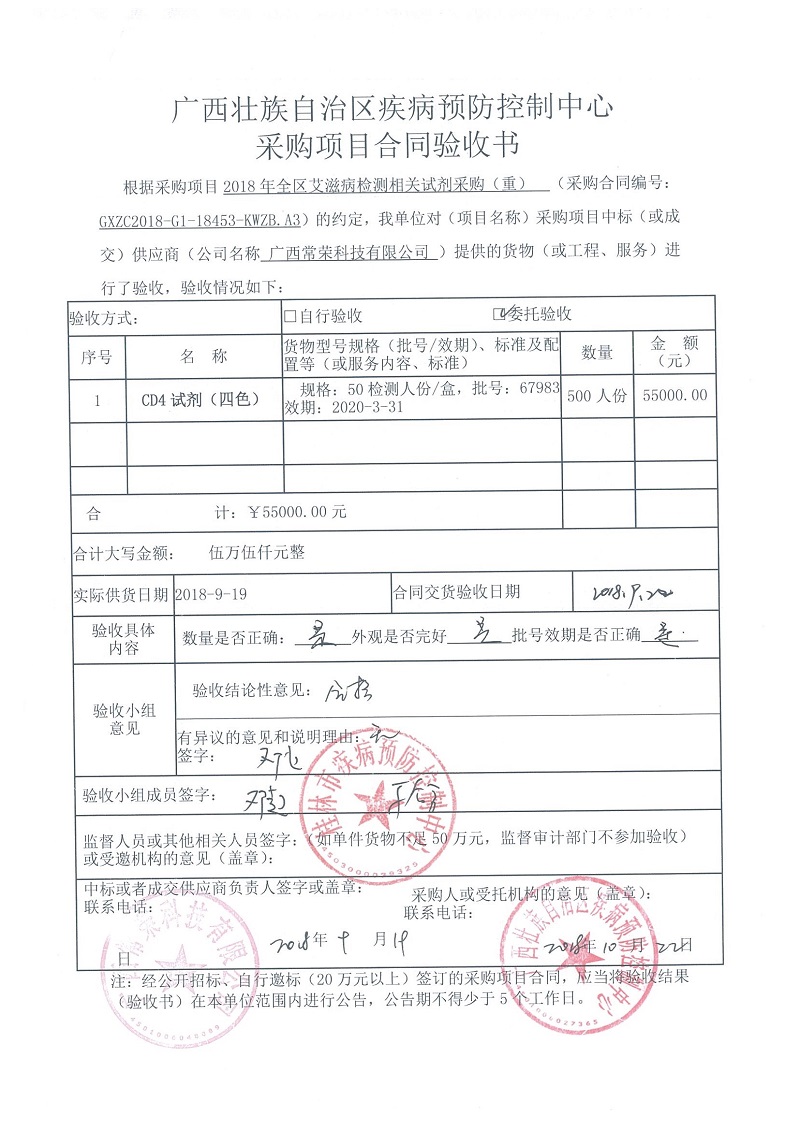 根据《广西壮族自治区政府采购项目履约验收管理办法》(桂财采〔2015〕22号 )的文件要求,现将合同名称:艾滋病免费检测试剂采购(GXZC2018-G1-18453-KWZB-A3)的验收情况公告如下: