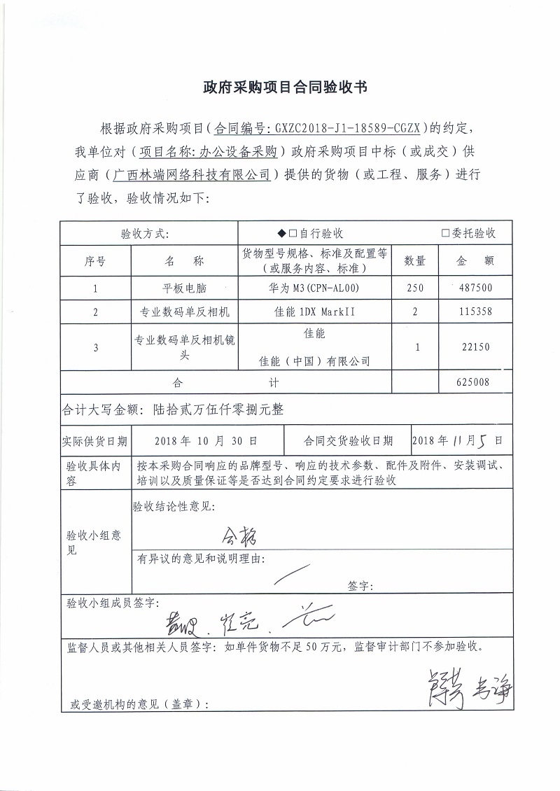 根据《广西壮族自治区政府采购项目履约验收管理办法》(桂财采〔2015〕22号 )的文件要求,现将合同名称:办公设备采购(GXZC2018-J1-18589-CGZX-B)的验收情况公告如下: