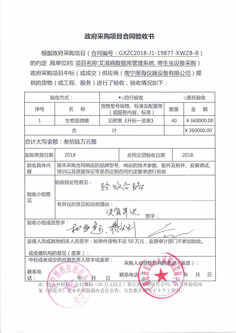 根据《广西壮族自治区政府采购项目履约验收管理办法》(桂财采〔2015〕22号 )的文件要求,现将合同名称:艾滋病数据库管理系统、寄生虫设备采购(GXZC2018-J1-19877-KWZB-B)的验收情况公告如下: