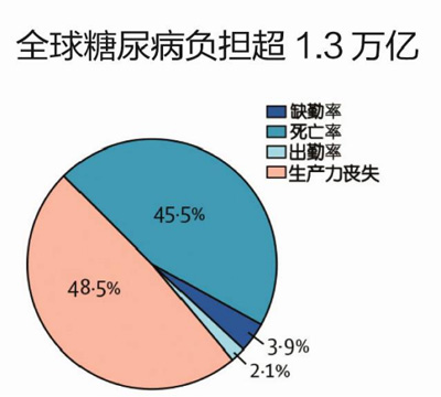 糖尿病给社会带来沉重的经济负担,德国学者对WHO数据分析显示,2015年全球糖尿病经济负担为1.31万亿,占全球国内生产总值(GDP)的1.8%。其中,间接费用占总费用的34.7%,占全球GDP的0.6%。导致间接费用最常见的原因为劳动力丧失(48.5%)和死亡率(45.5%),其次为缺勤率(3.9%)和出勤率(2.1%)。