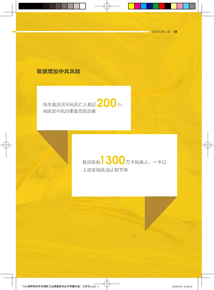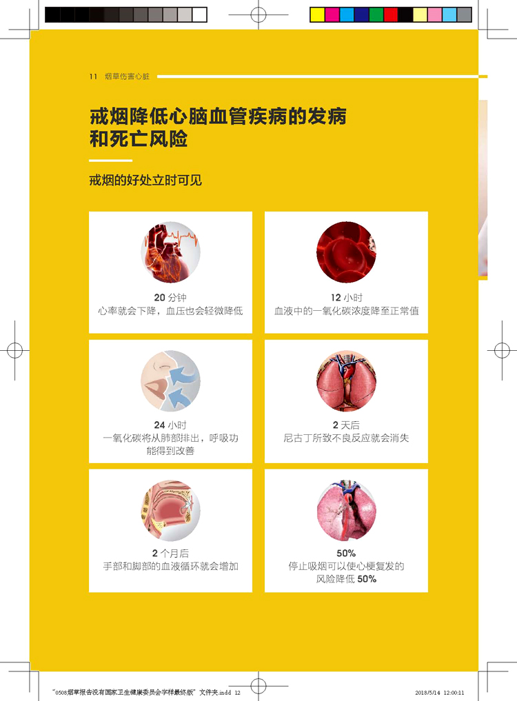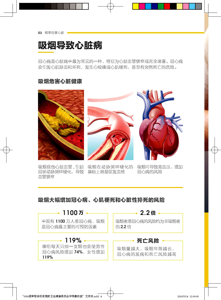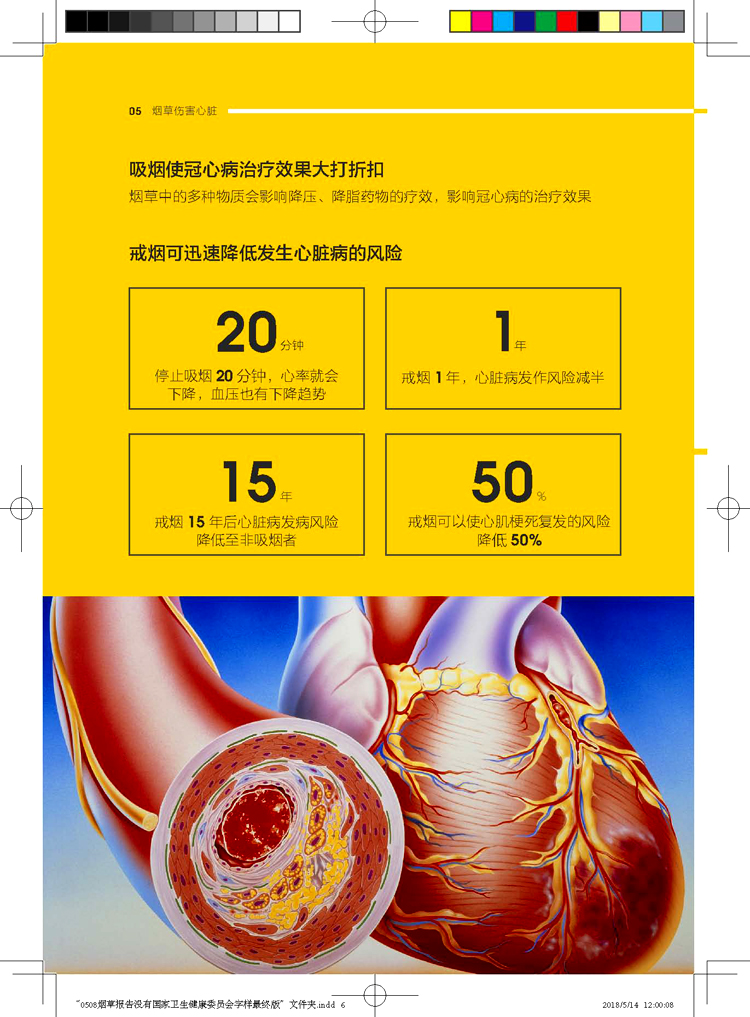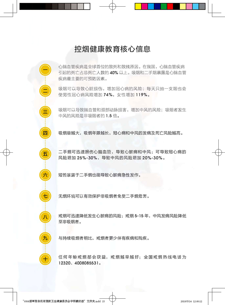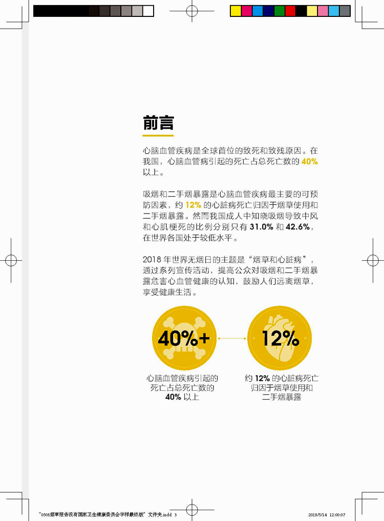 2018年世界无烟日核心信息围绕“烟草和心脏病”展开,重点阐述了吸烟与心脑血管疾病间的关联、吸烟和二手烟暴露导致心脑血管损伤的机理,提高公众对吸烟和二手烟暴露对心血管危害的认识以及尽早戒烟的意愿。