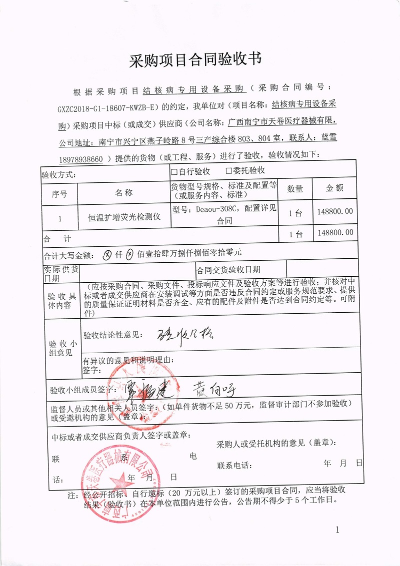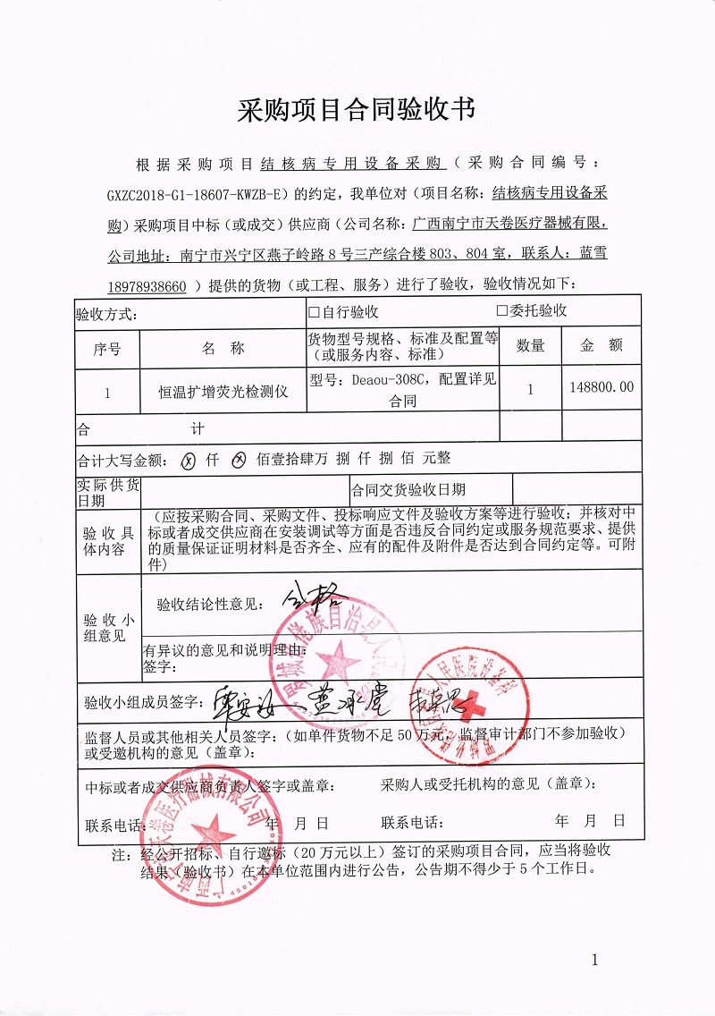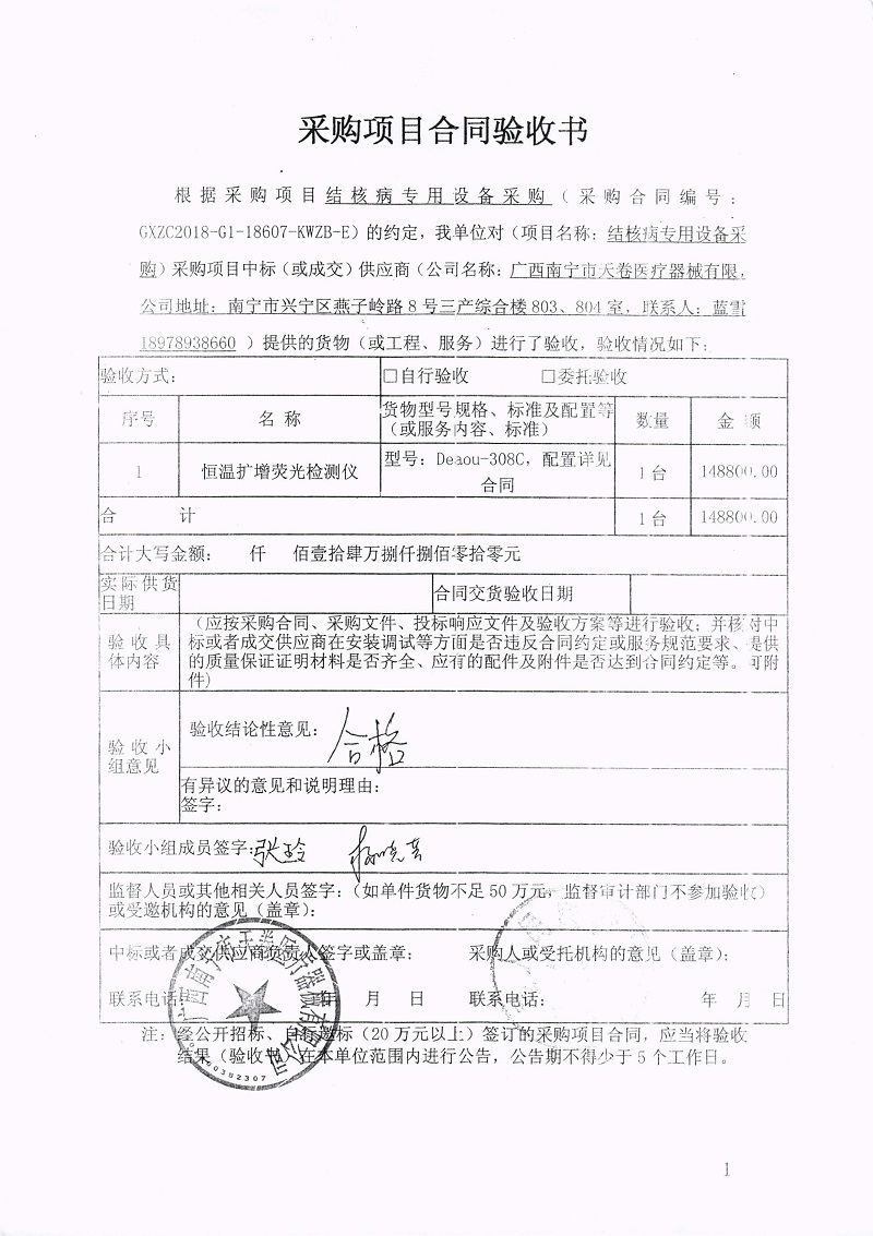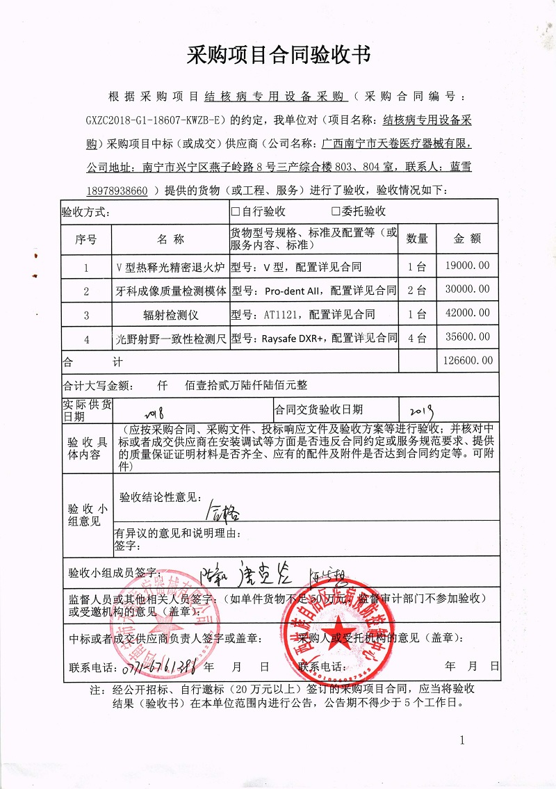 根据《广西壮族自治区政府采购项目履约验收管理办法》(桂财采〔2015〕22号 )的文件要求,现将合同名称: 结核病专用设备采购(GXZC2018-G1-18607-KWZB-E)的验收情况公告如下: