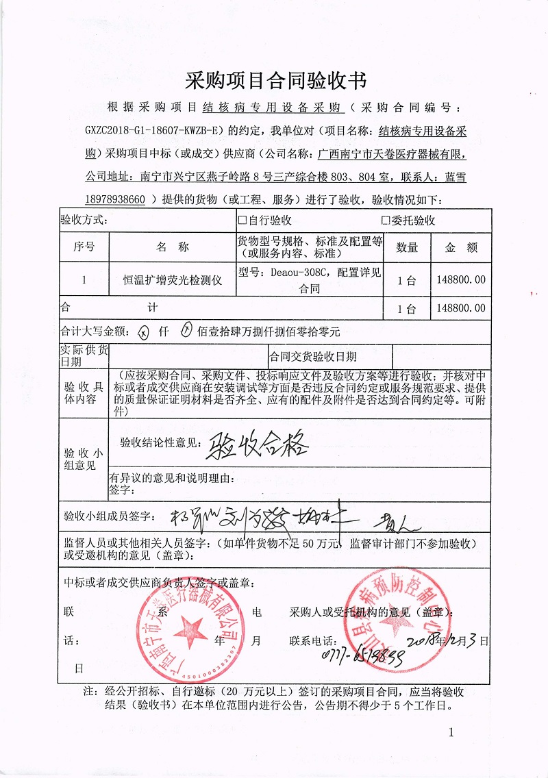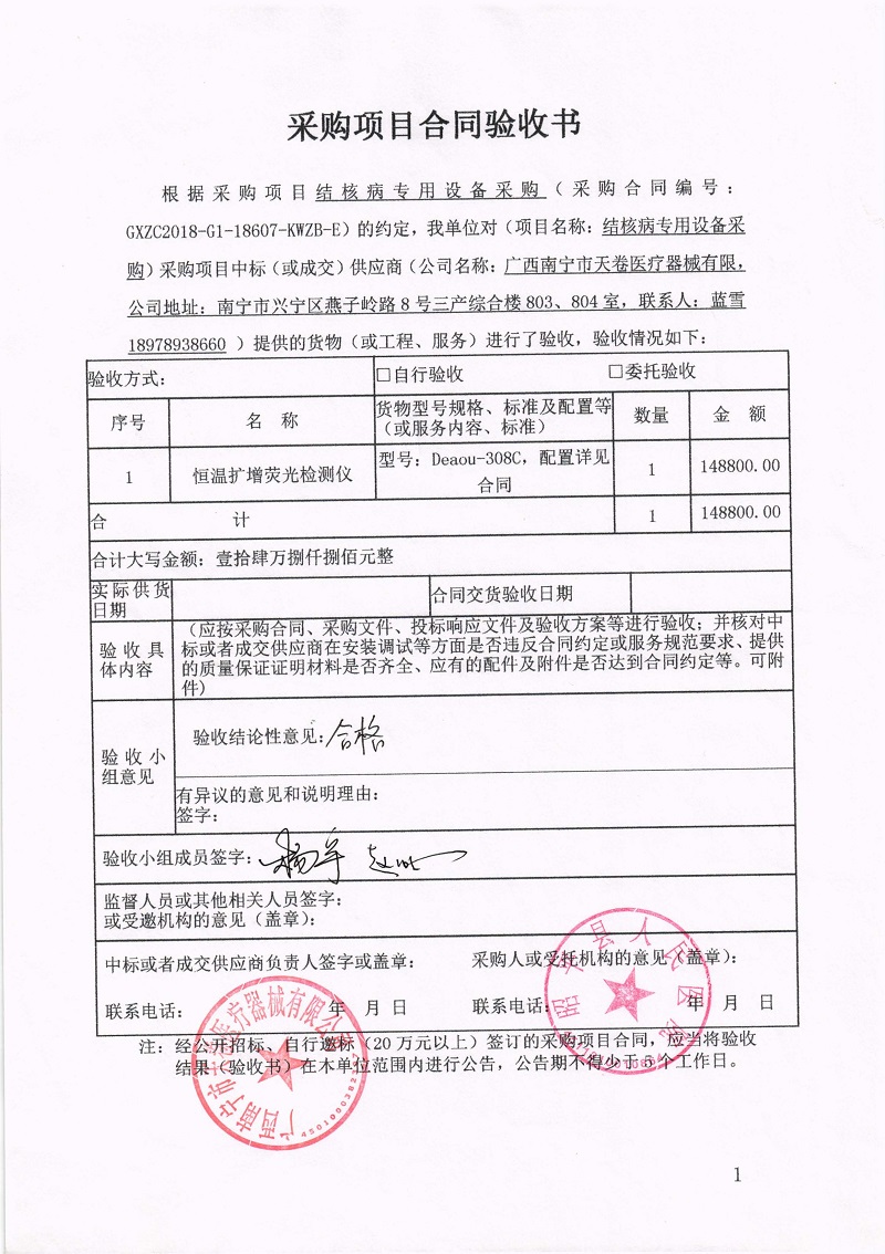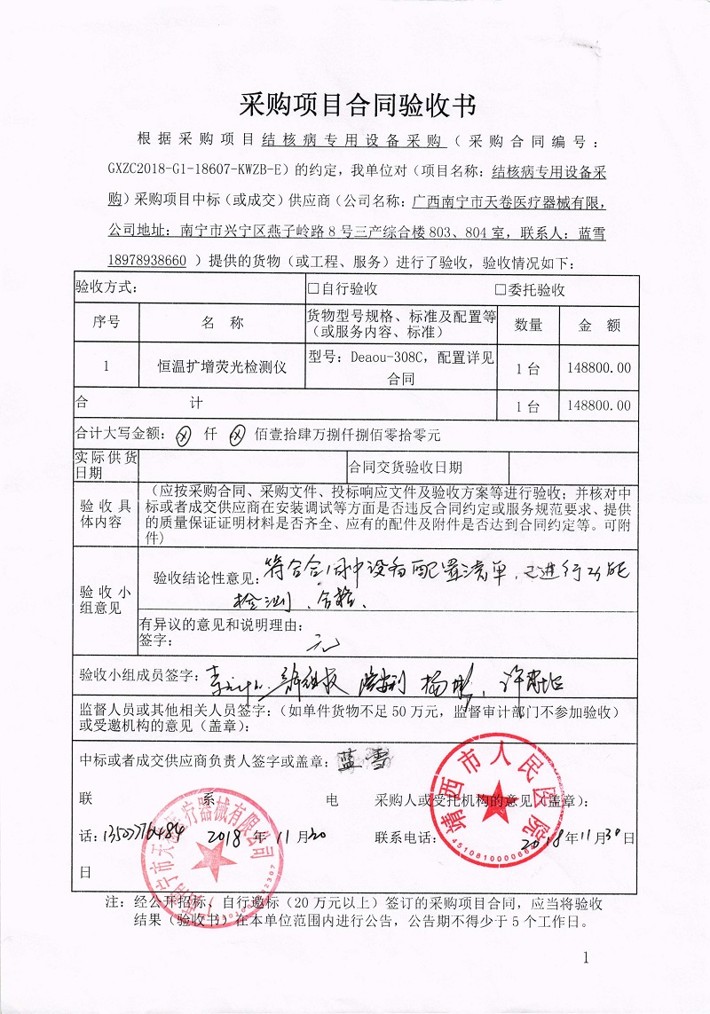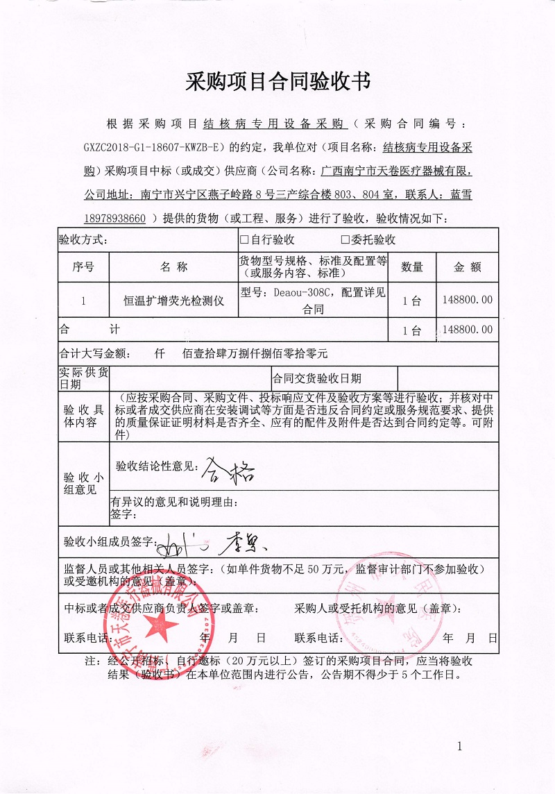 根据《广西壮族自治区政府采购项目履约验收管理办法》(桂财采〔2015〕22号 )的文件要求,现将合同名称: 结核病专用设备采购(GXZC2018-G1-18607-KWZB-E)的验收情况公告如下: