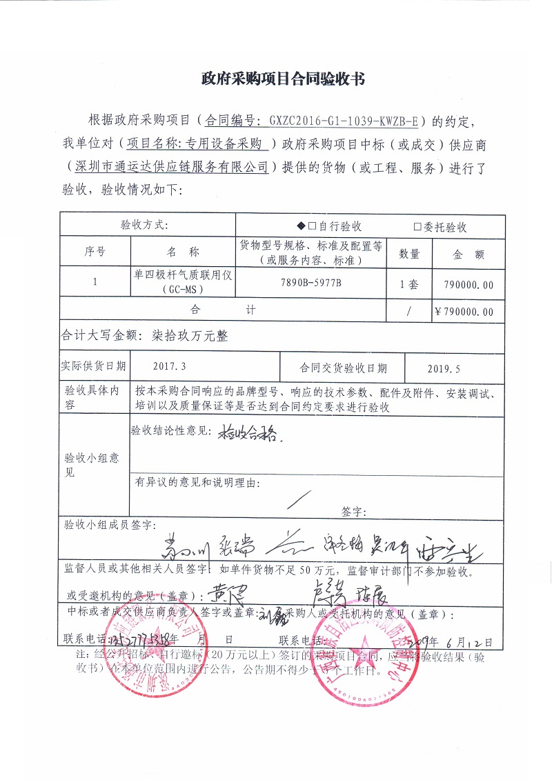 根据《广西壮族自治区政府采购项目履约验收管理办法》(桂财采〔2015〕22号 )的文件要求,现将合同名称:专用设备采购(GXZC2016-G1-1039-KWZB-E)的验收情况公告如下: