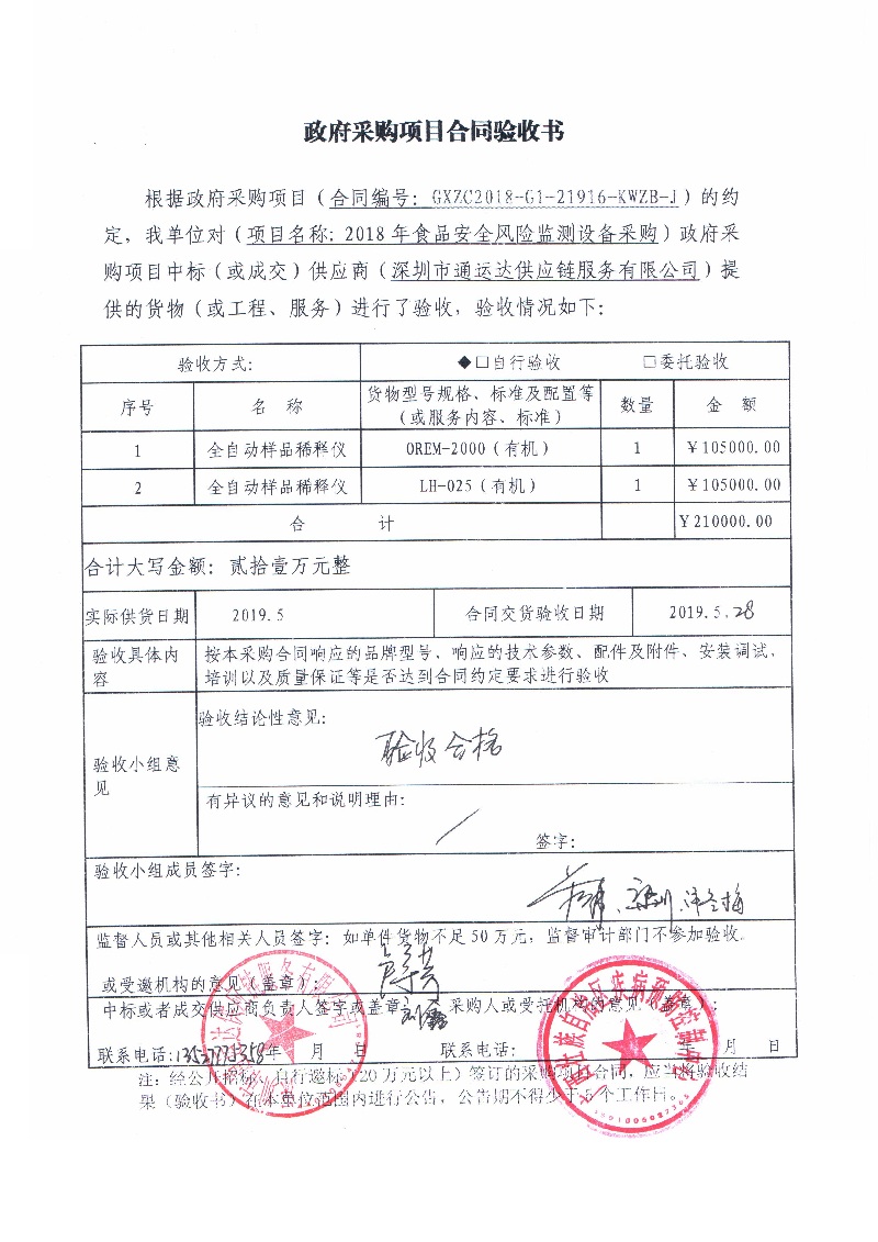 根据《广西壮族自治区政府采购项目履约验收管理办法》(桂财采〔2015〕22号 )的文件要求,现将合同名称:2018年食品安全风险监测设备采购(GXZC2018-G1-21916-KWZB-J)的验收情况公告如下: