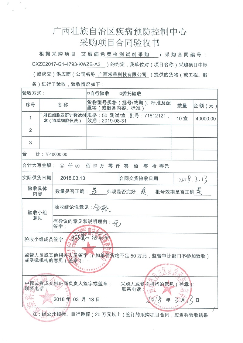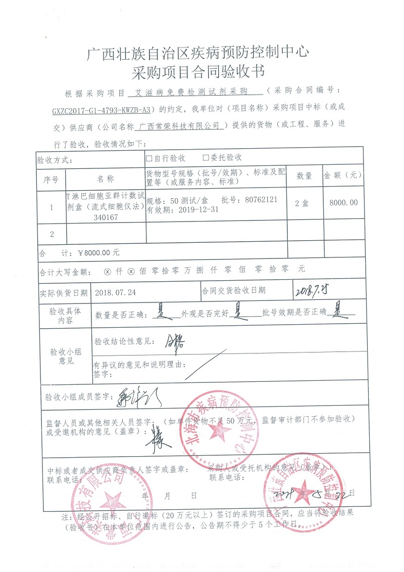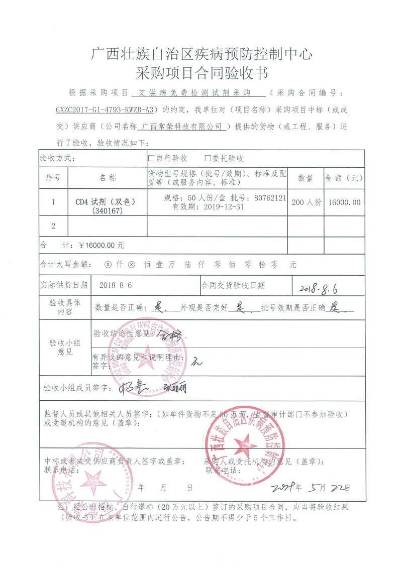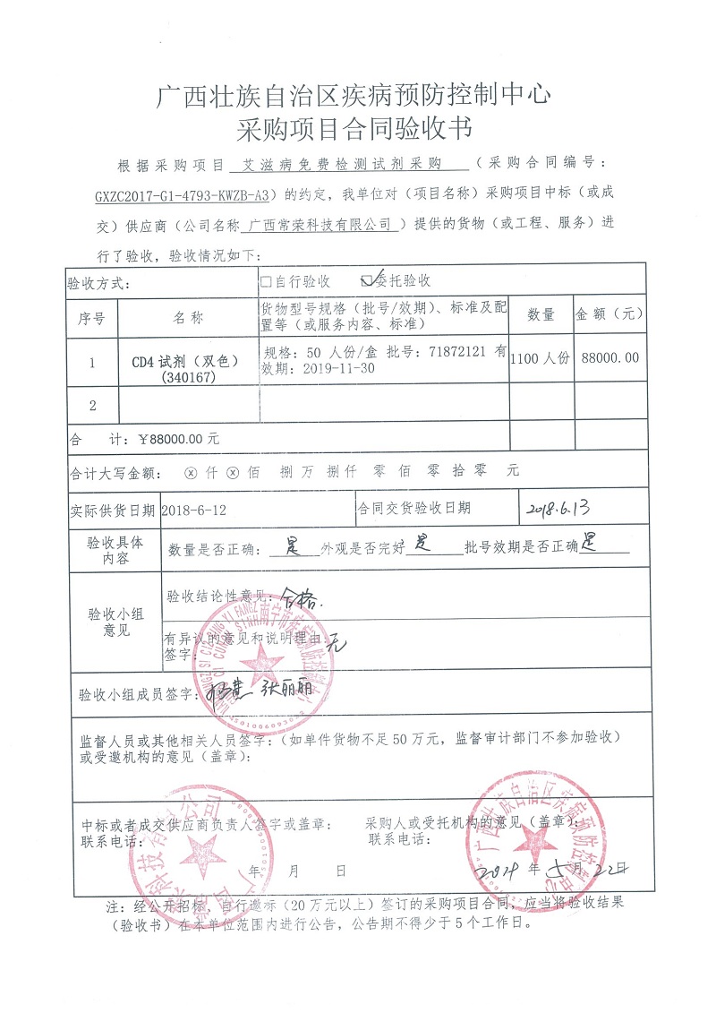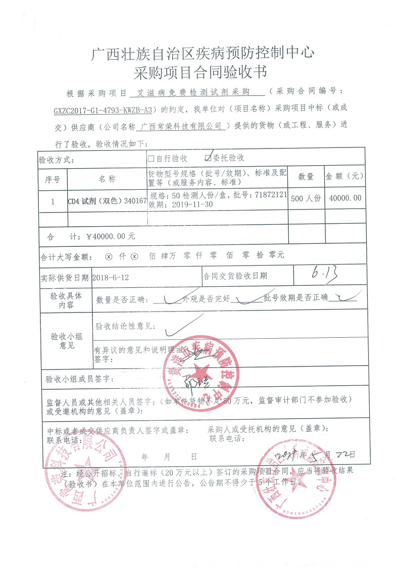 根据《广西壮族自治区政府采购项目履约验收管理办法》(桂财采〔2015〕22号 )的文件要求,现将合同名称:艾滋病免费检测试剂采购(GXZC2017-G1-4793-KWZB-A3)的验收情况公告如下: