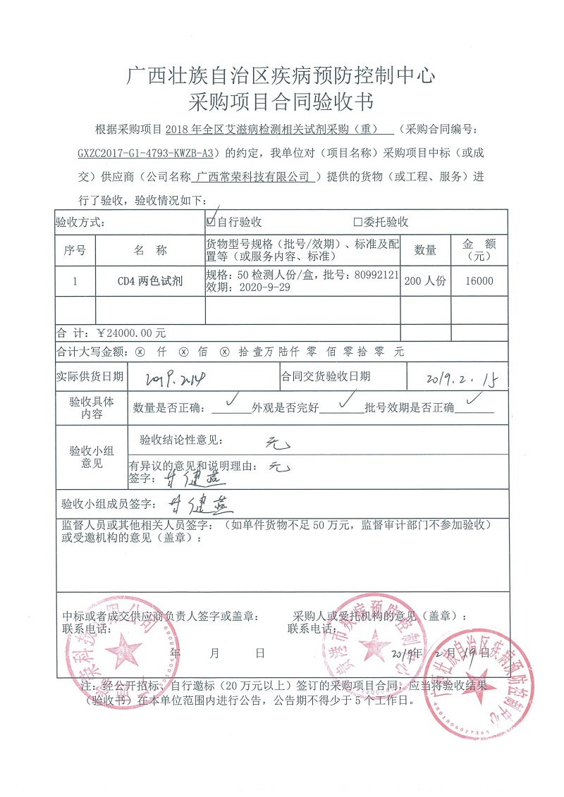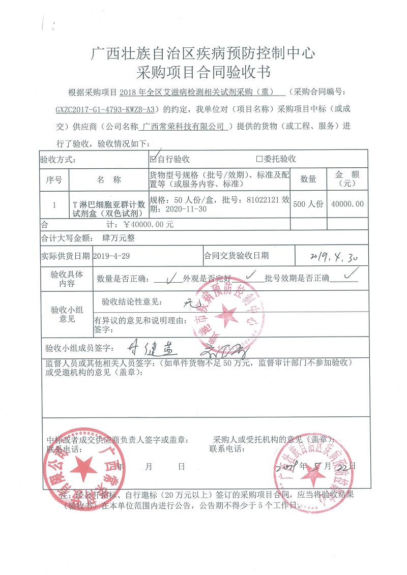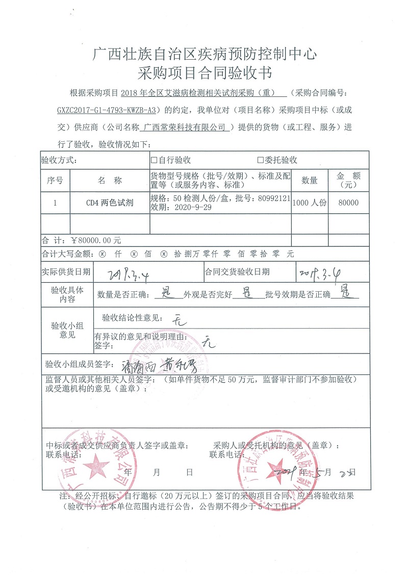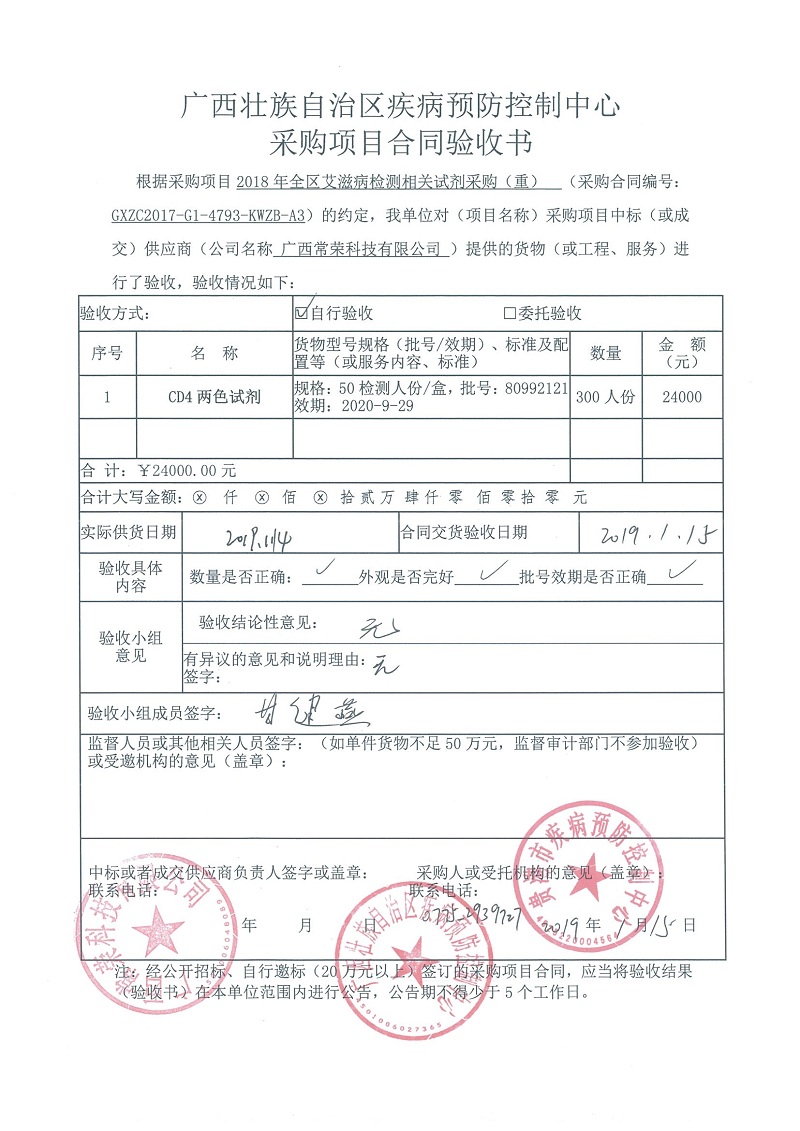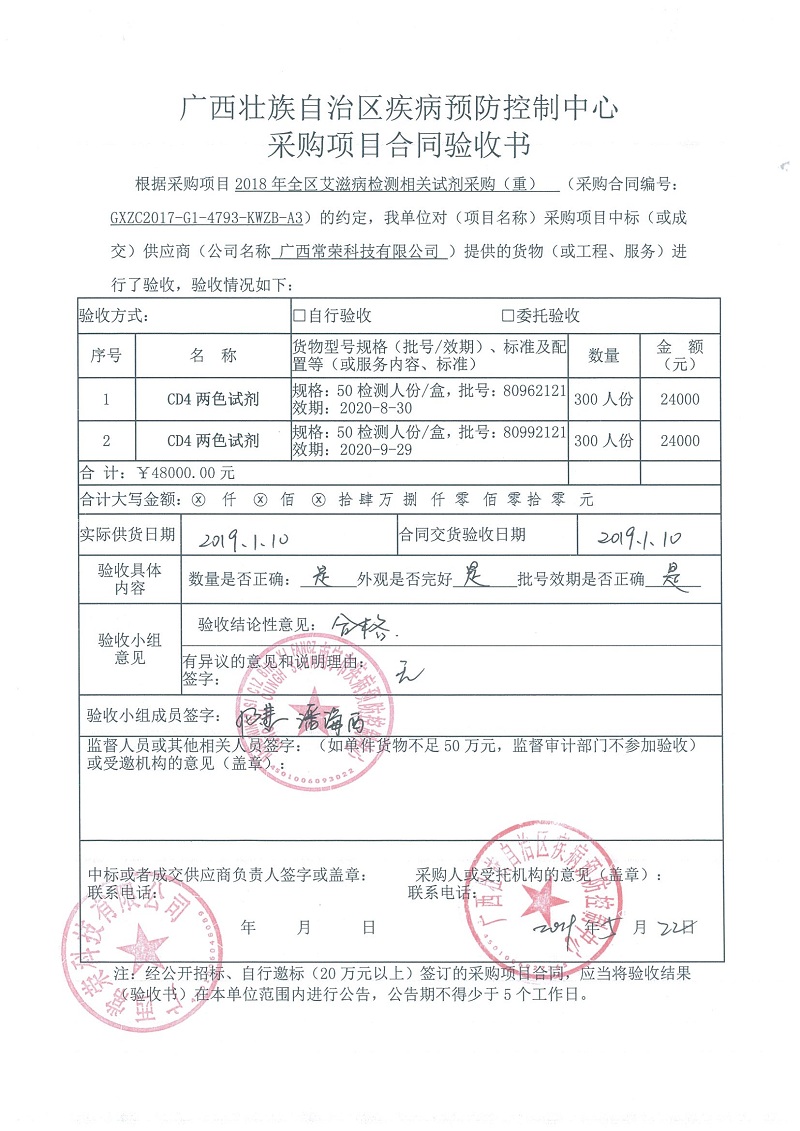 根据《广西壮族自治区政府采购项目履约验收管理办法》(桂财采〔2015〕22号 )的文件要求,现将合同名称:艾滋病免费检测试剂采购(GXZC2017-G1-4793-KWZB-A3)的验收情况公告如下: