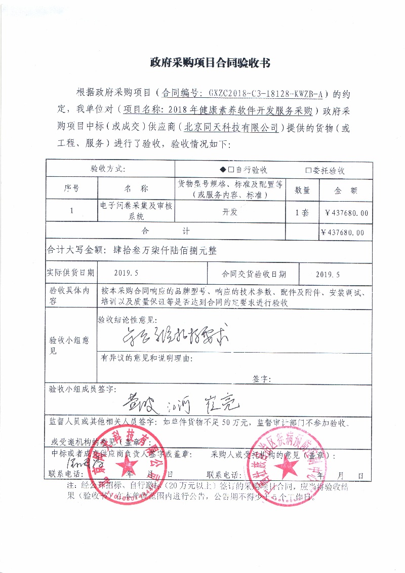 根据《广西壮族自治区政府采购项目履约验收管理办法》(桂财采〔2015〕22号 )的文件要求,现将合同名称:2018年健康素养软件开发服务采购(GXZC2018-C3-18128-KWZB-A)的验收情况公告如下: