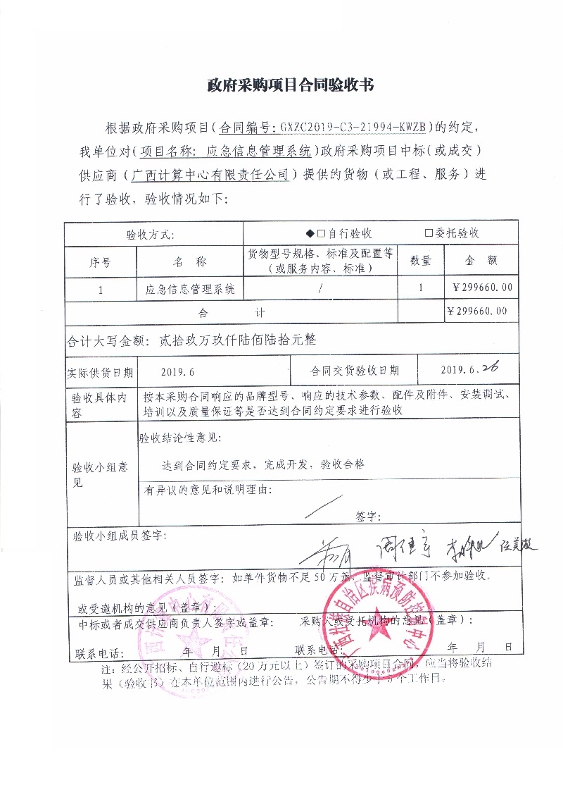 根据《广西壮族自治区政府采购项目履约验收管理办法》(桂财采〔2015〕22号 )的文件要求,现将合同名称:应急信息管理系统采购(GXZC2019-C3-21994-KWZB)的验收情况公告如下: