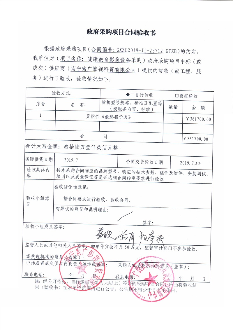 根据《广西壮族自治区政府采购项目履约验收管理办法》(桂财采〔2015〕22号 )的文件要求,现将合同名称:健康教育影像设备采购(GXZC2019-J1-23712-GTZB)的验收情况公告如下: