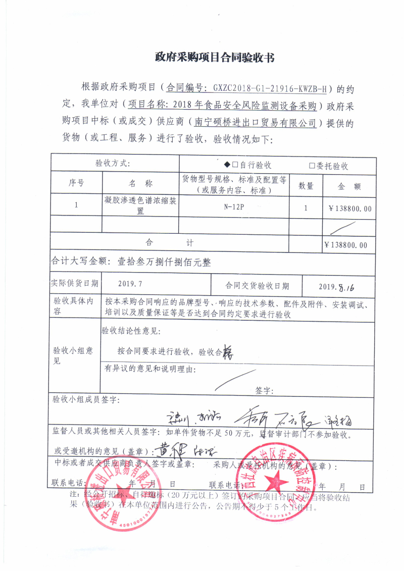根据《广西壮族自治区政府采购项目履约验收管理办法》(桂财采〔2015〕22号 )的文件要求,现将合同名称:2018年食品安全风险监测设备采购(GXZC2018-G1-21916-KWZB-H)的验收情况公告如下: