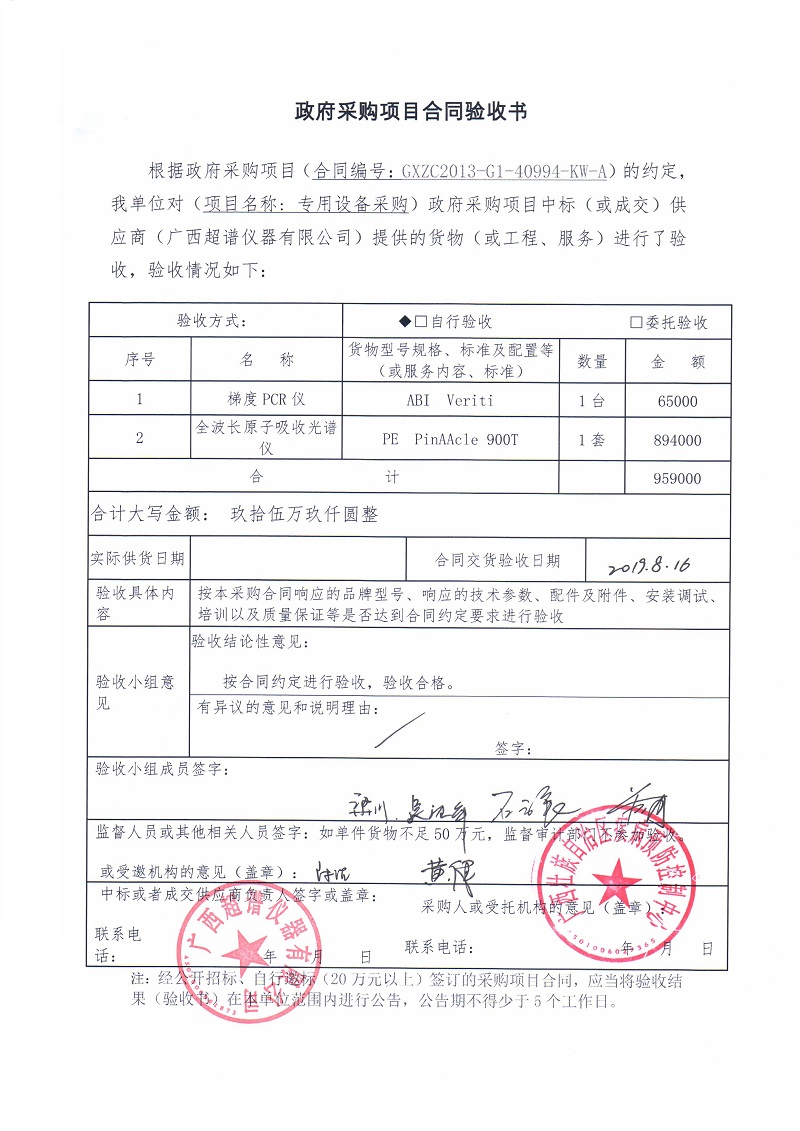 根据《广西壮族自治区政府采购项目履约验收管理办法》(桂财采〔2015〕22号 )的文件要求,现将合同名称:专用设备采购(GXZC2013-G1-40994-KW-A)的验收情况公告如下: